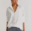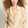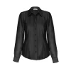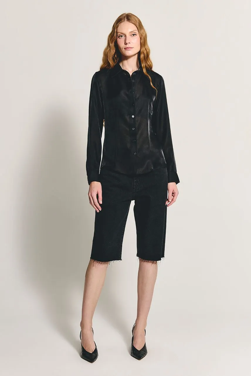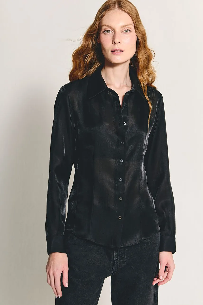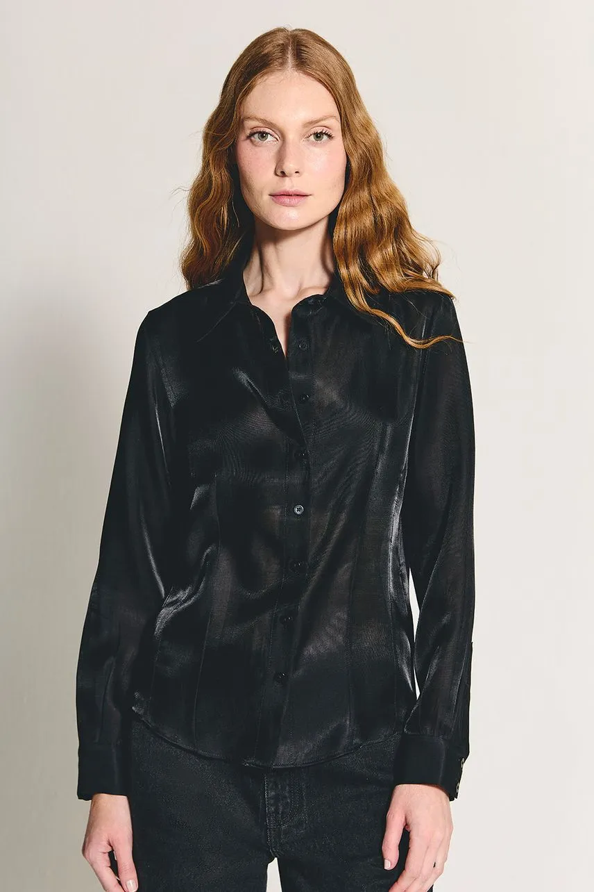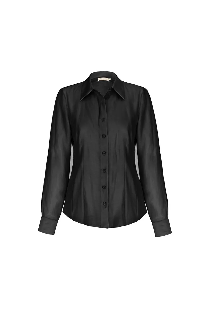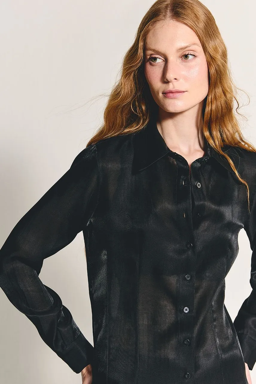 Camisa manga longa em organza com modelagem ajustada por pregas. Possui botões no tom da peça nos punhos e no fechamento frontal.
