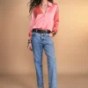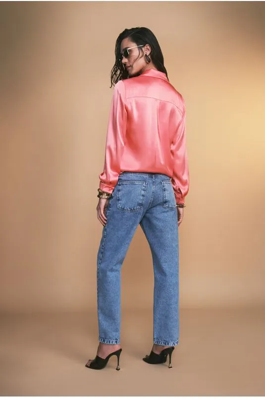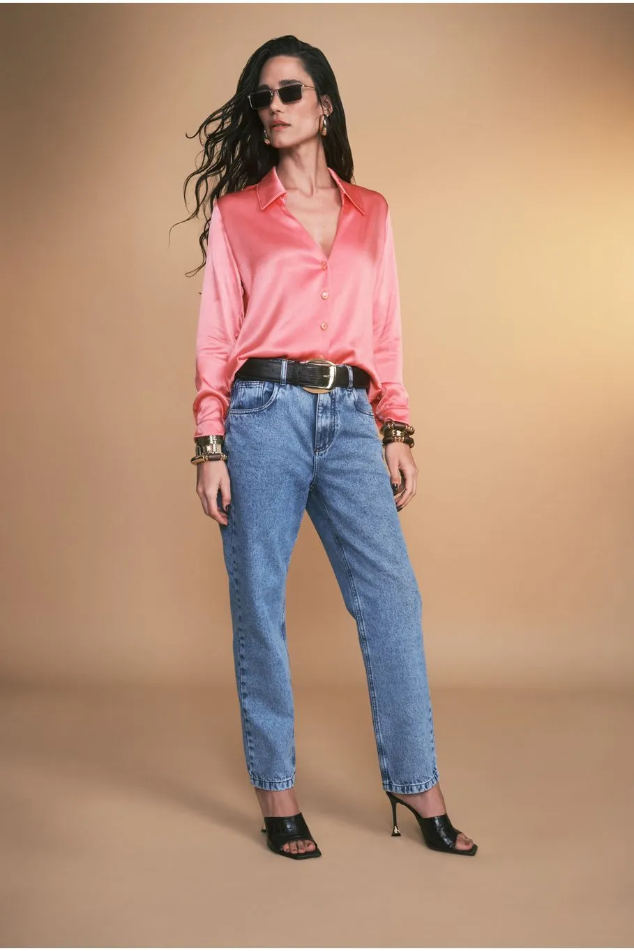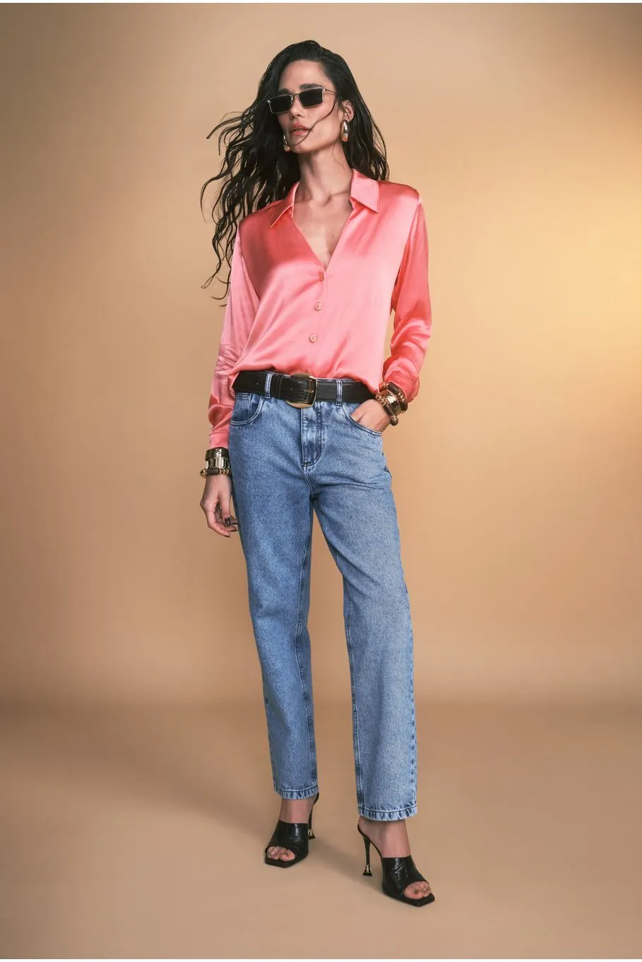 A camisa Laura é confeccionada em viscose. A peça apresenta modelagem solta e tecido com um leve brilho, proporcionando um visual moderno e elegante.