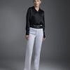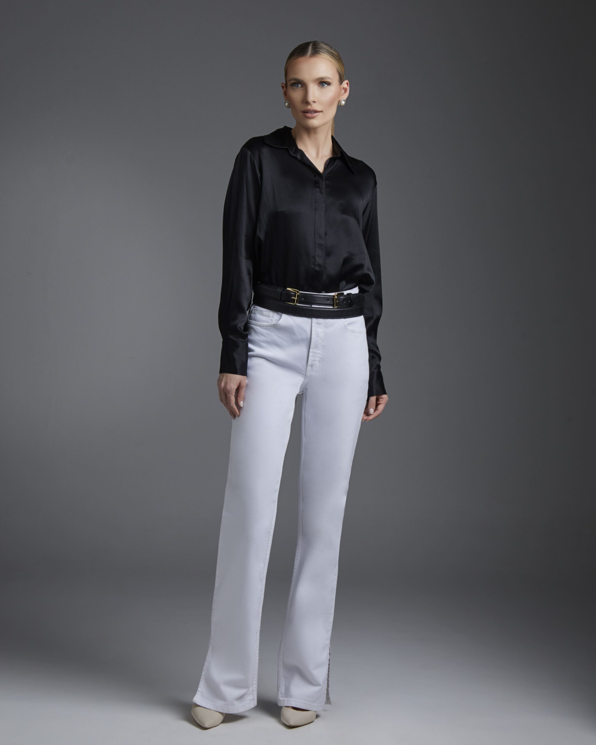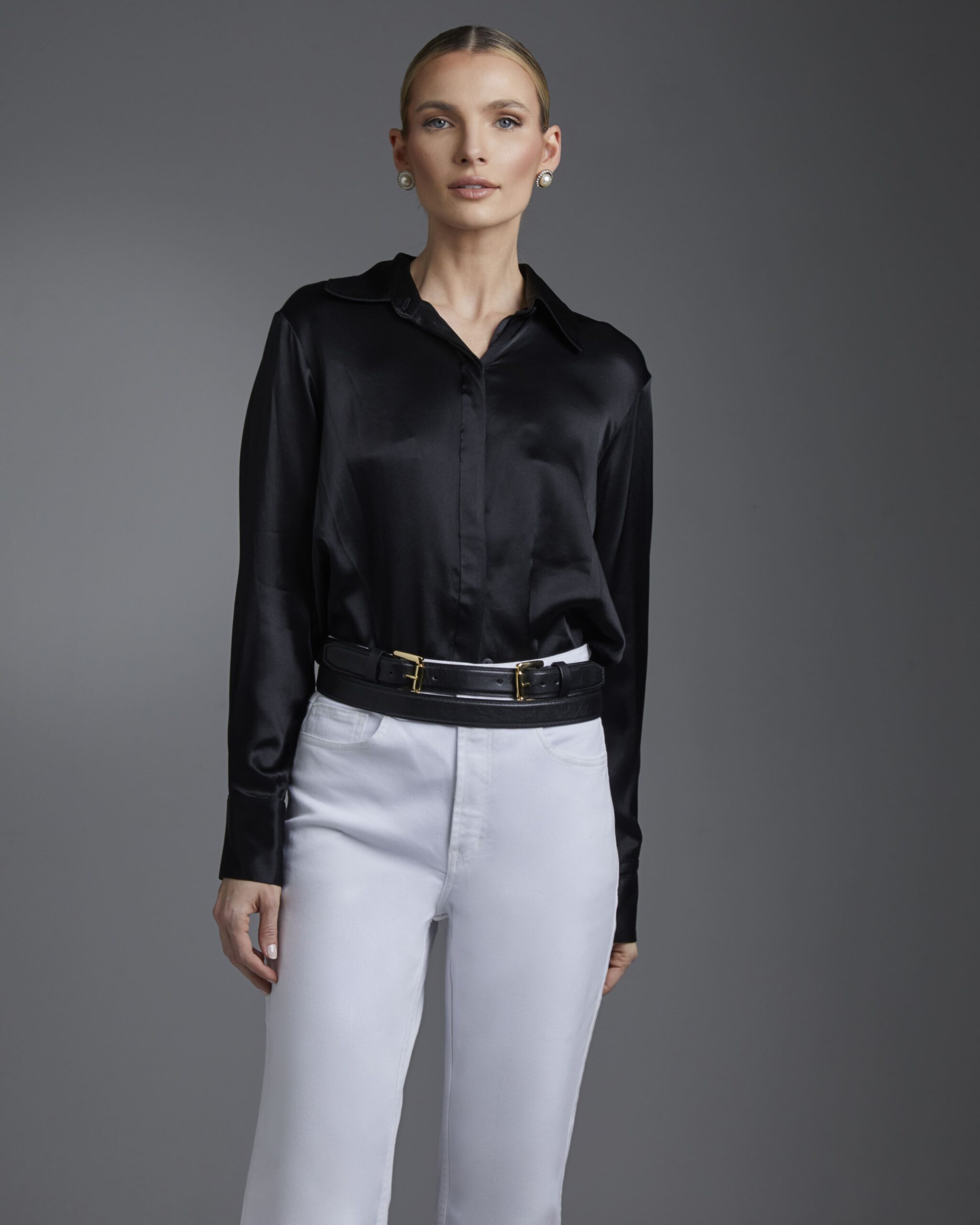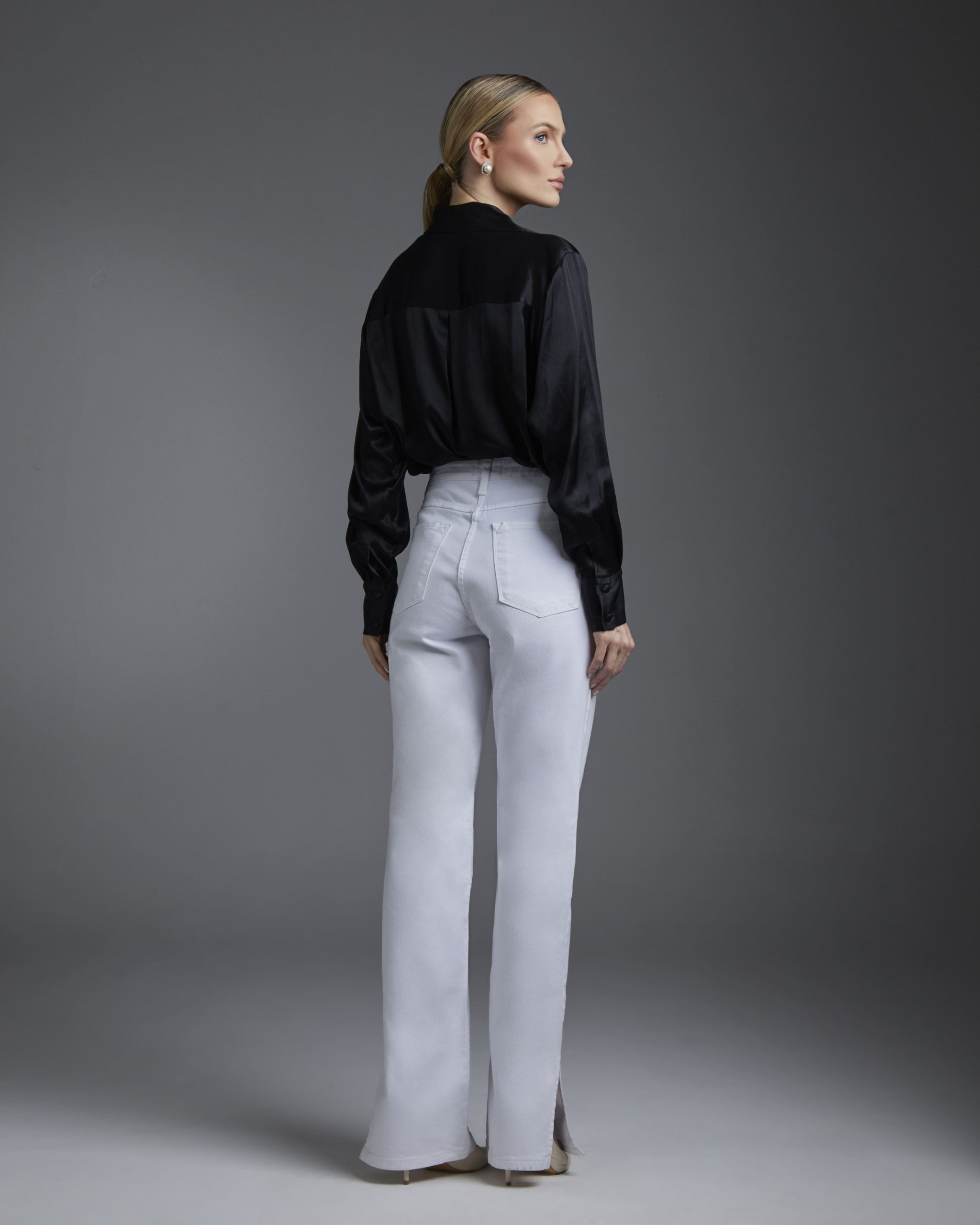 A camisa Luna é confeccionada em cetim. A peça apresenta modelagem solta em comprimento tradicional, com botões anterior, proporcionando um visual moderno e elegante. Possui mangas compridas com fechamento no punho, lapelas e acabamento pespontado.