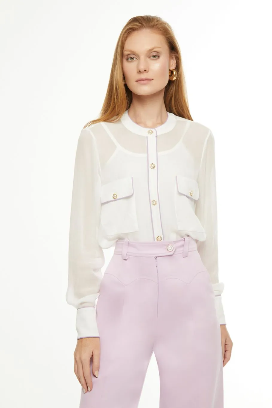 A camisa Vivian é confeccionada em viscose. A peça na cor preta apresenta modelagem solta com viés off lilás, proporcionando um visual clássico e moderno. Possui leve transparência, mangas compridas, decote redondo, bolsos anterior, acabamento pespontado e fechamento por botões de metal.