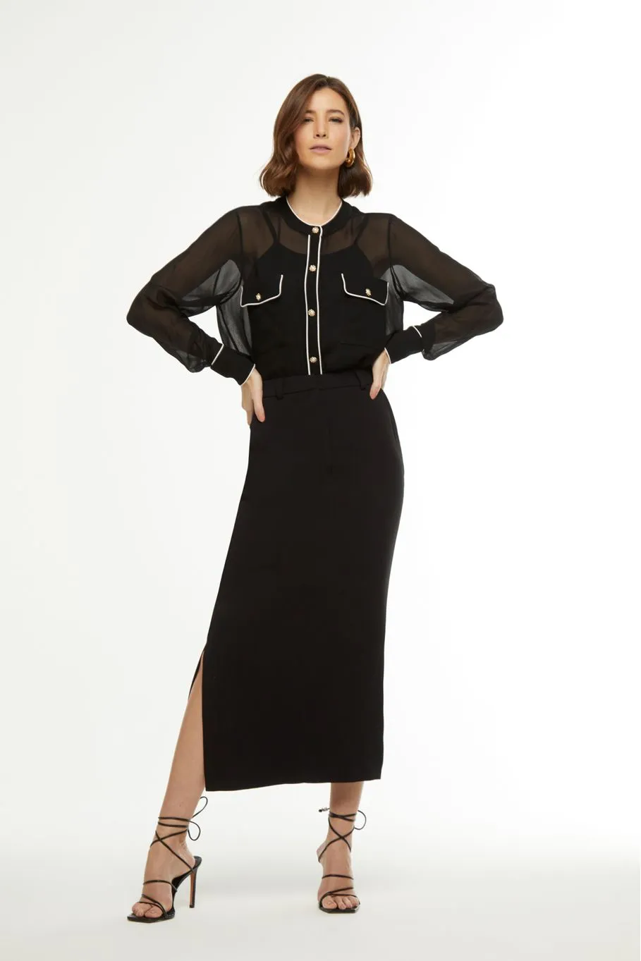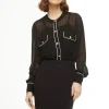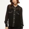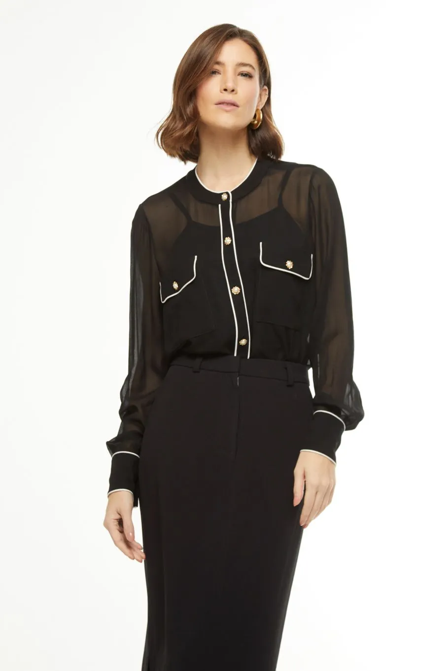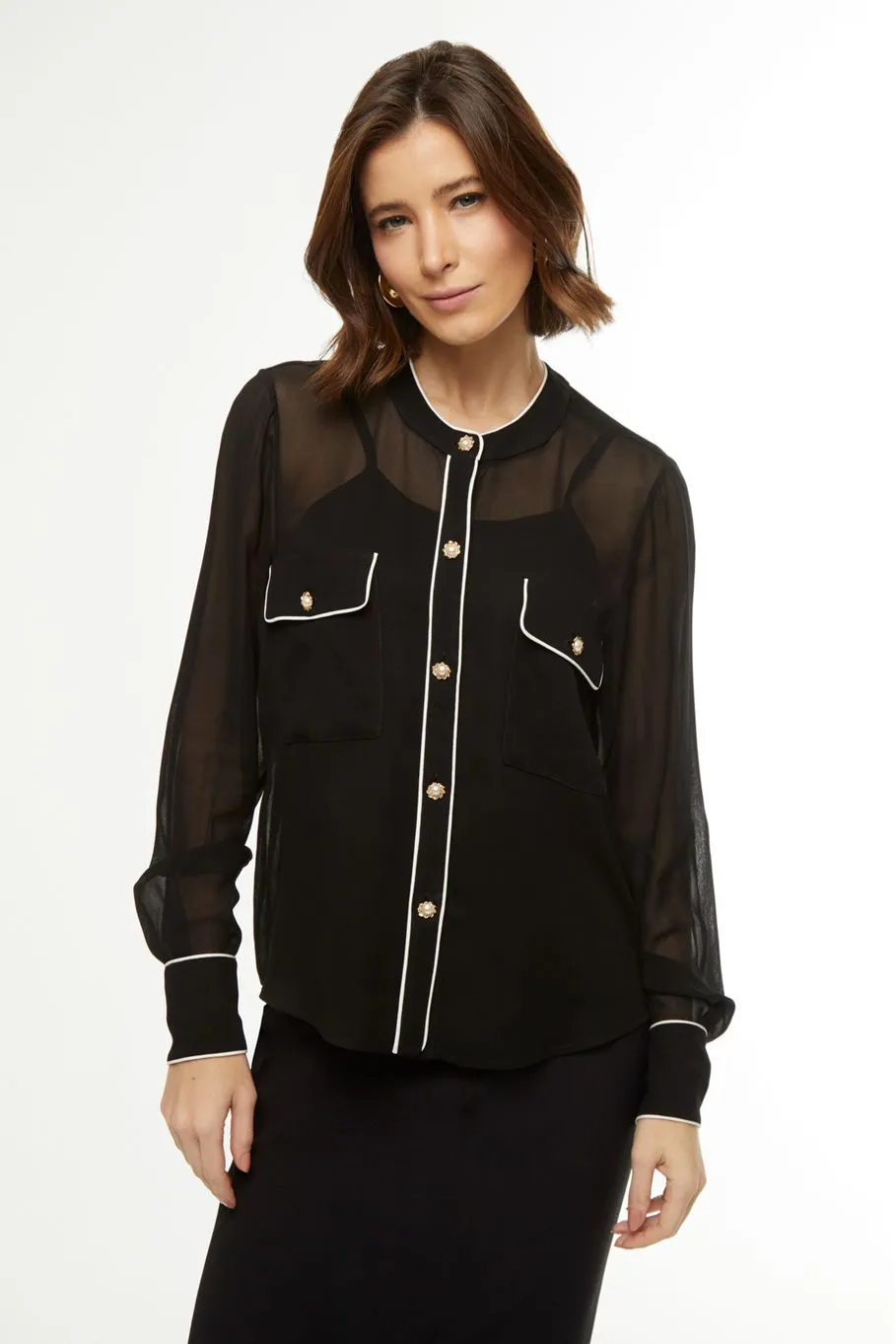 A camisa Vivian é confeccionada em viscose. A peça na cor preta apresenta modelagem solta com viés off white, proporcionando um visual clássico e moderno. Possui leve transparência, mangas compridas, decote redondo, bolsos anterior, acabamento pespontado e fechamento por botões de metal.