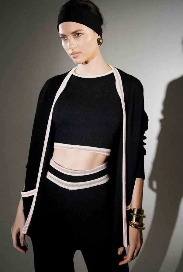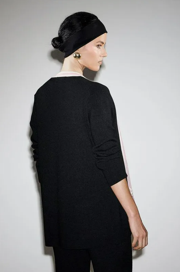 O cardigan Betina é confeccionado em tricot. A peça preta apresenta modelagem solta com bolsos anterior e detalhes listrados nas extremidades, proporcionando um visual comfy e moderno. Possui comprimento médio, manga comprida e acabamento pespontado. Por se tratar de um tecido delicado, é necessário cuidado ao lavar.