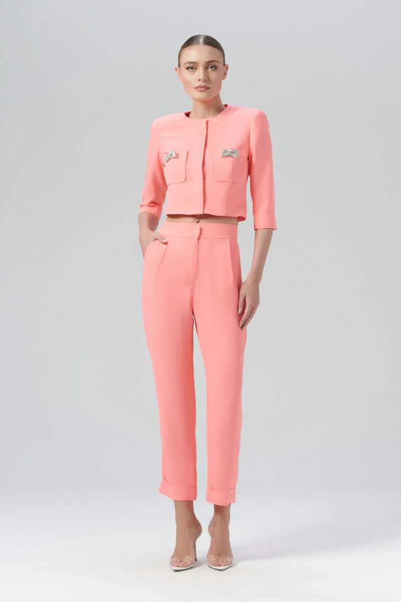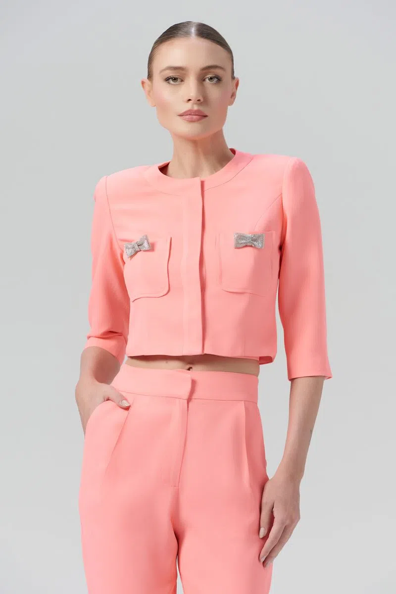 O casaco Rosie é confeccionado em alfaiataria. A peça apresenta modelagem solta com bolsos e detalhes de lacinhos revestidos em brilhos, proporcionando um visual moderno e glamouroso. Possui comprimento curto, mangas compridas, decote redondo, forro embutido, acabamento pespontado e fechamento por botões internos. Peça com detalhes delicados, recomenda-se cuidado ao lavar.