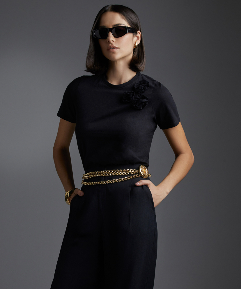 O cinto Agnes é confeccionado no metal dourado, com detalhes de camadas de correntes e um pingente da flor Agnes, proporcionando um visual elegante e moderno.