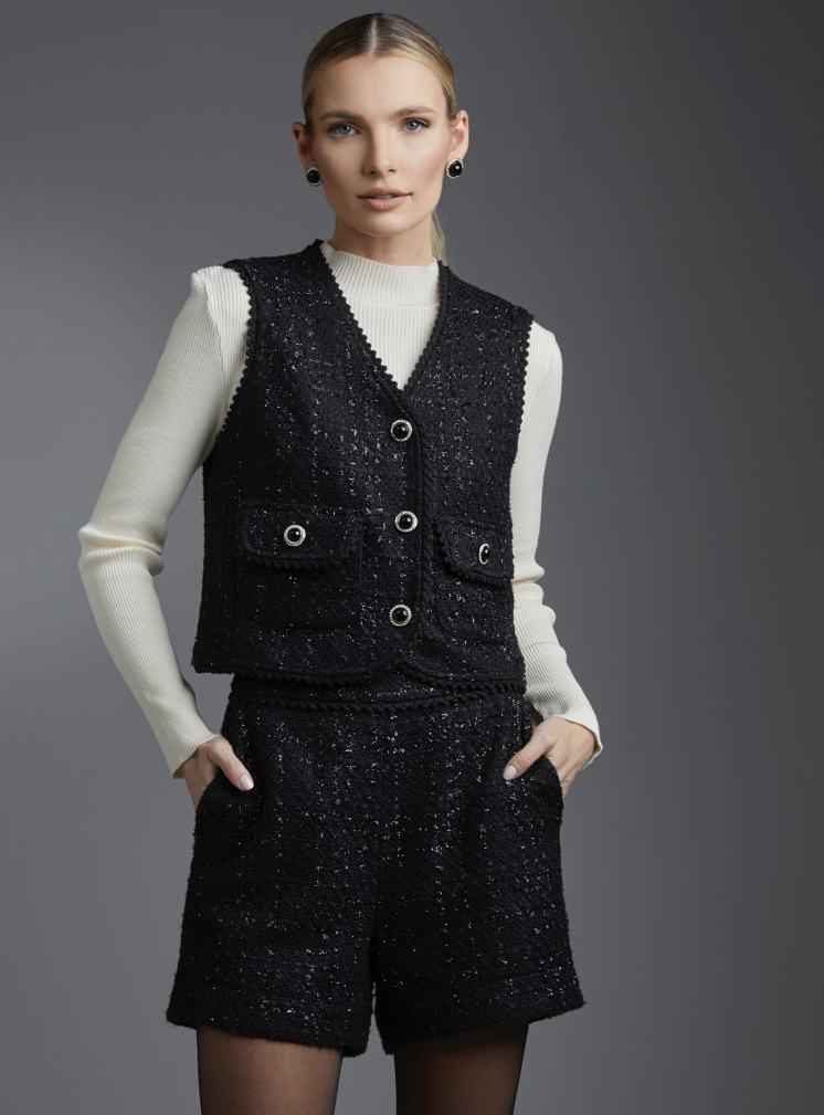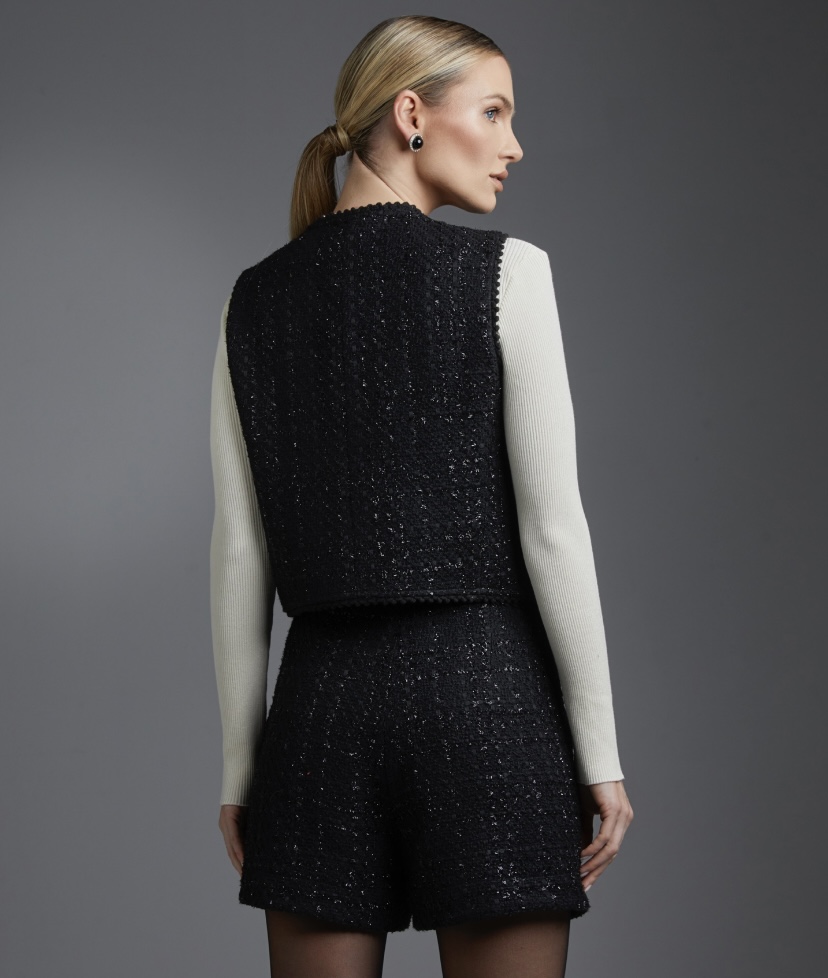 O colete Clarice é confeccionado em jacquard com pontos de brilhos em lurex. A peça na cor off white, apresenta modelagem solta com decote em formato V e detalhes em crochê preto nas extremidades, proporcionando modernidade ao visual. Possui comprimento curto, alças largas, bolsos anteriores, forro embutido e botões em pérola negra com strass cristal para fechamento. é recomendado cuidado ao lavar a peça, por se tratar de um tecido delicado.