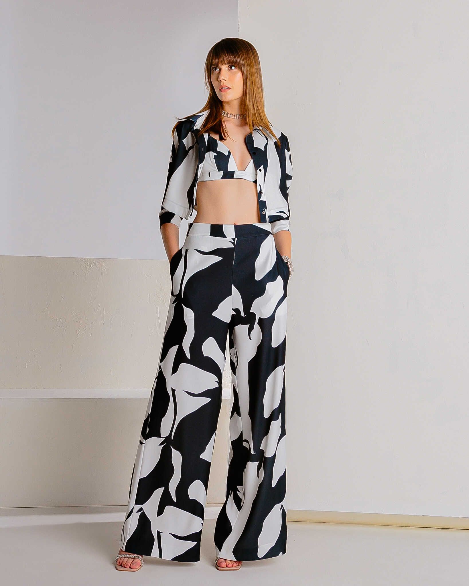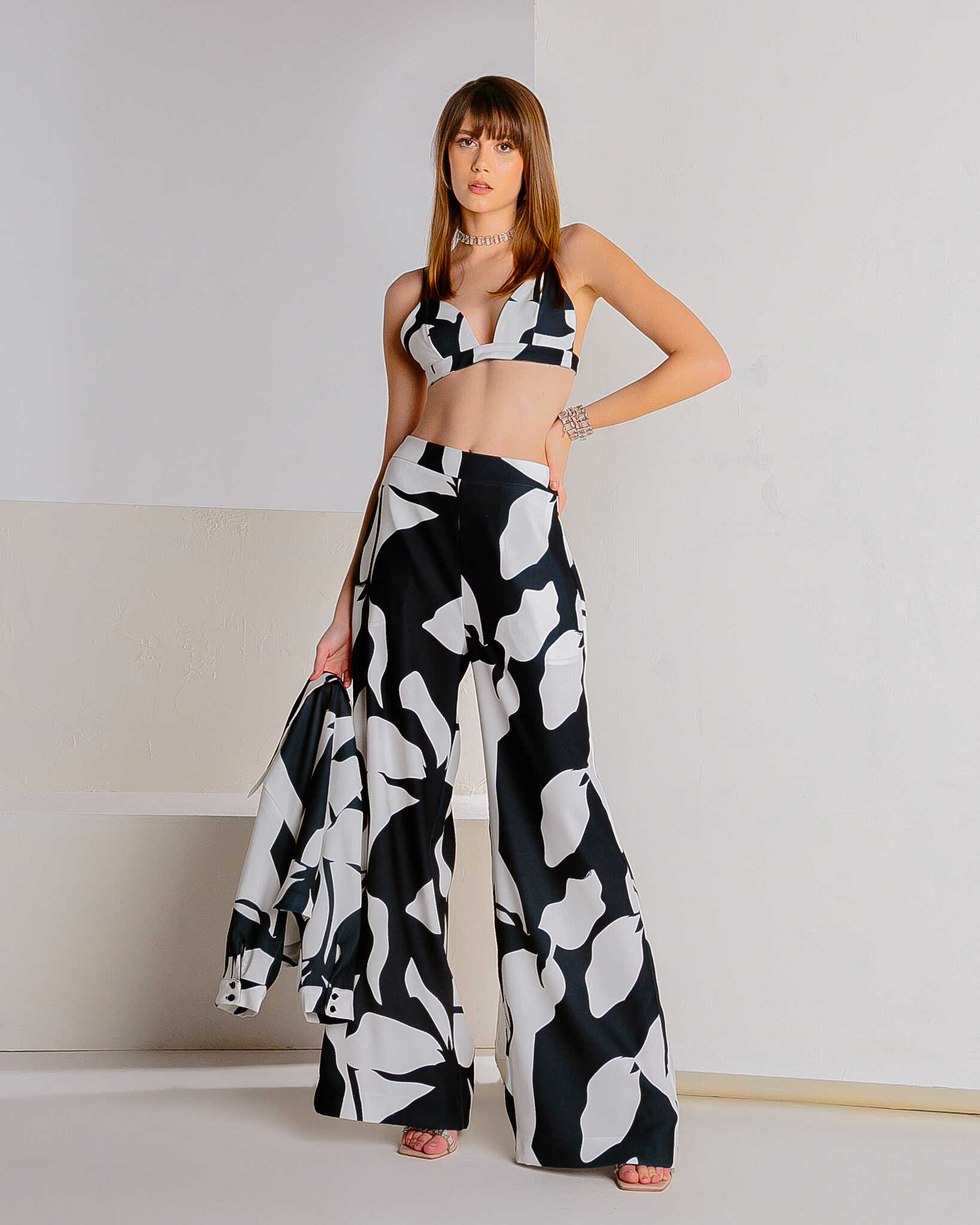 Conjunto composto por três peças casaco, top e calça.