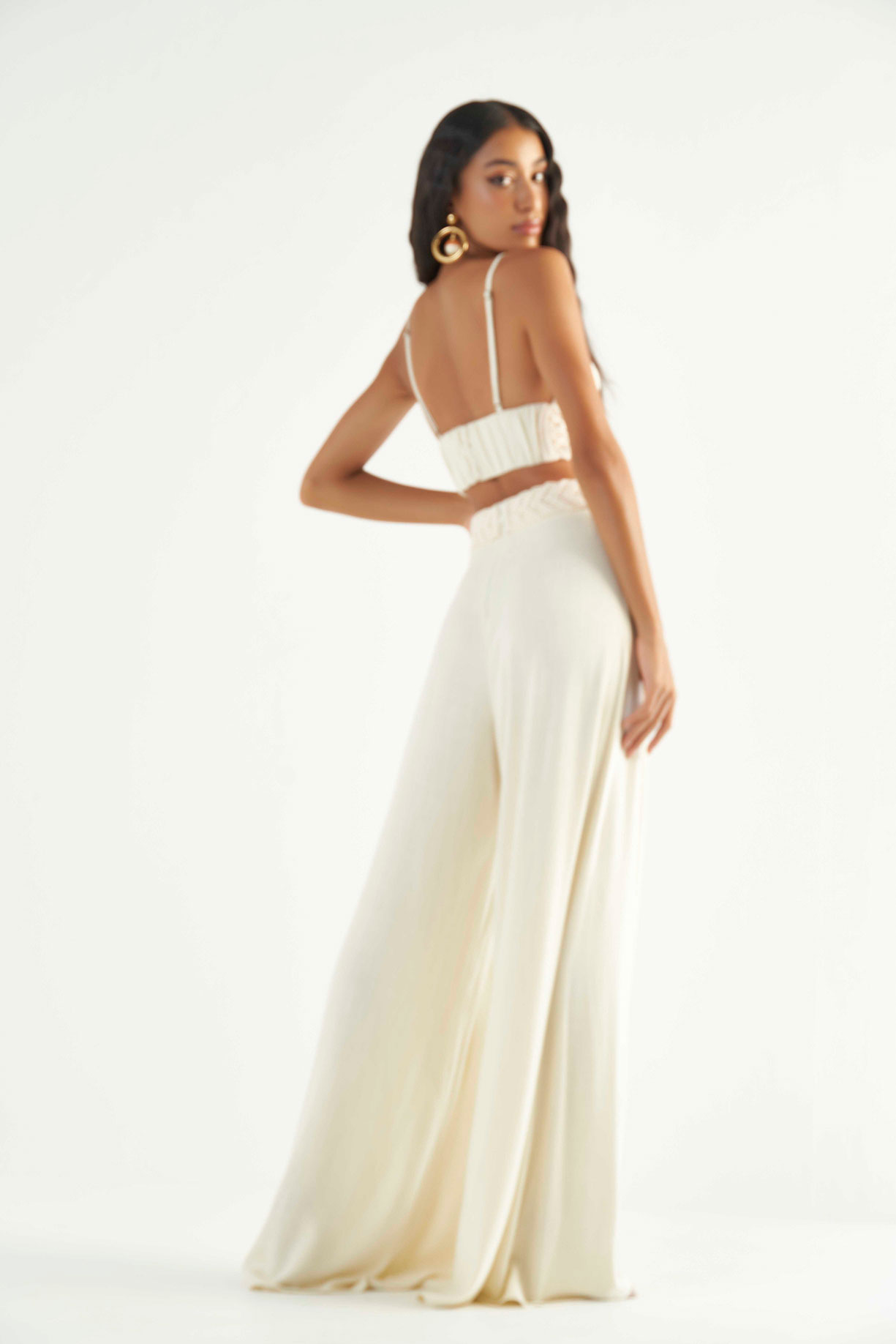 Conjunto em linho, a peça possui detalhe em Macramê aplicado sobreposto no busto, calça pantalona também com detalhes em macramê no cós, fecho traseiro com ziper semi- invisível.