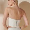 Corselet tomara que caia confeccionado em alfaiataria, estruturado e com acabamento embutido. Parte do busto com decote formato quadriculado. Fechamento posterior por zíper aparente. Confeccionado em Alfaiataria.