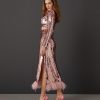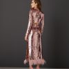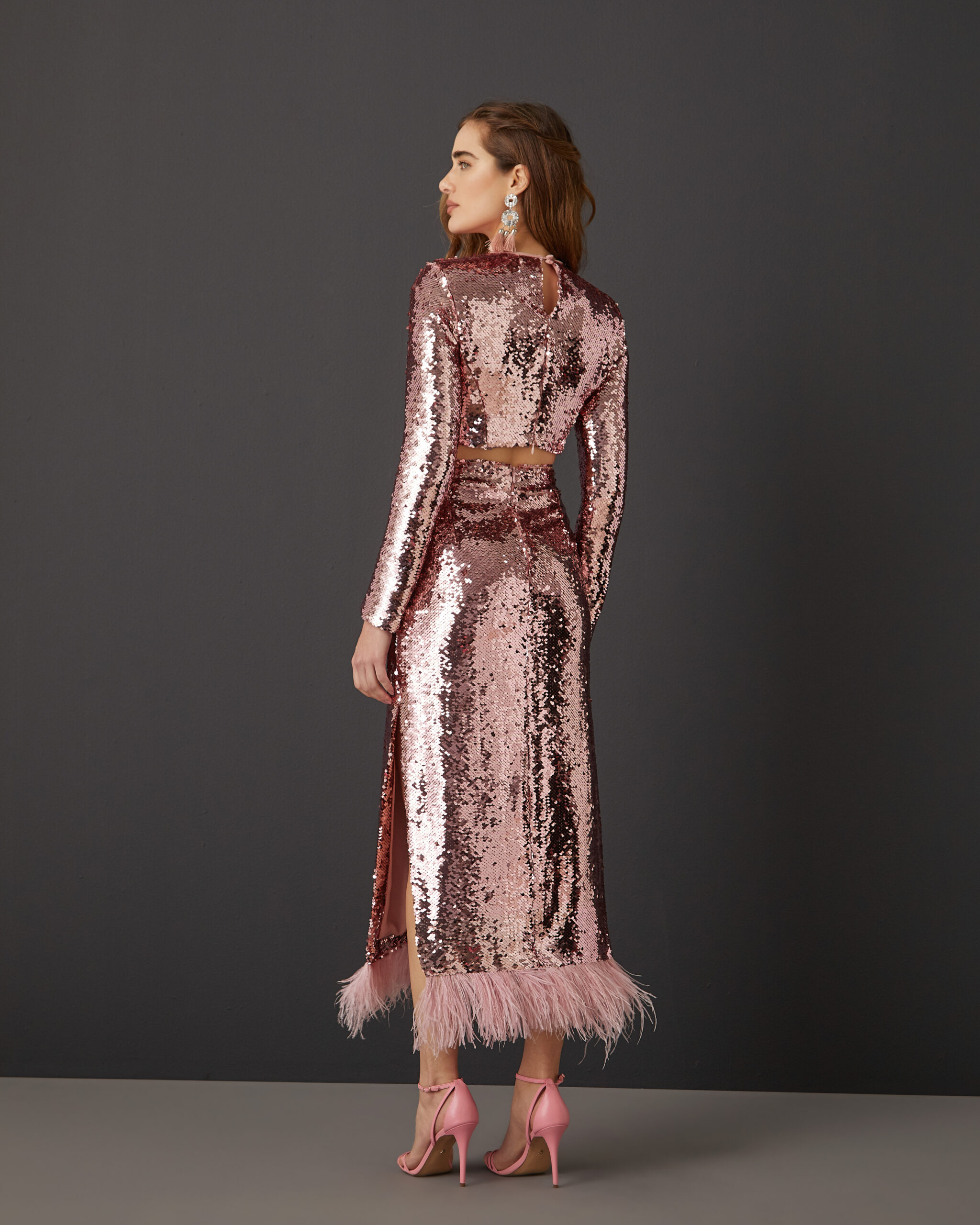A blusa cor de rosa é confeccionada em tecido de paetês. A peça apresenta textura em paetês e aspecto brilhoso, proporcionando um visual glam e elegante. Possui decote redondo, ombros estruturados por ombreiras, mangas longas com detalhe de zíper invisível nos punhos, caimento reto, comprimento cropped e acabamento invisível. Fecho anterior por zíper e botão.