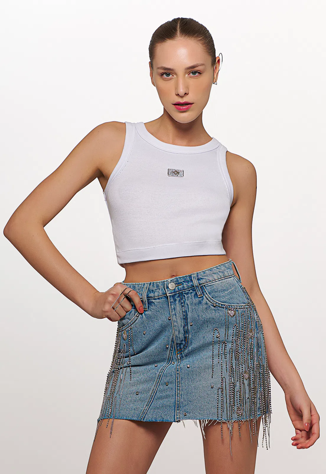 Adicione um toque de estilo à sua saia curta para passeio com nosso cropped tank top branco, destacado por uma placa metálica com o logo caos. para um look descontraído e fashion, combine-o com uma saia curta e botas slouch. complete o visual com acessórios delicados e uma bolsa crossbody. uma combinação fresca e moderna para aproveitar o passeio com confiança e charme.