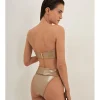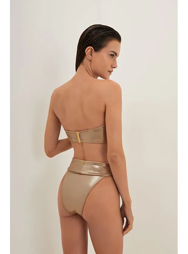 Hot pants metalizada com cava alta e detalhe torcido na pala sobreposta.