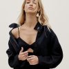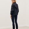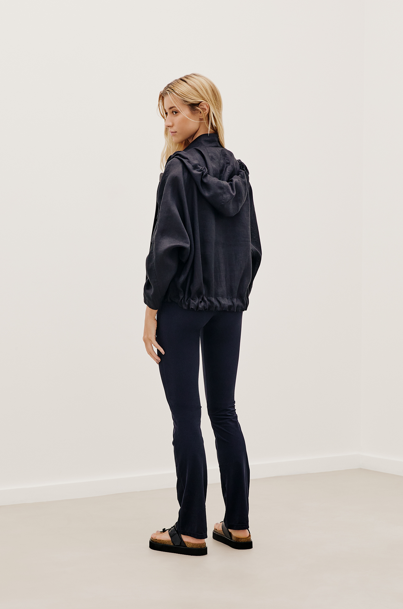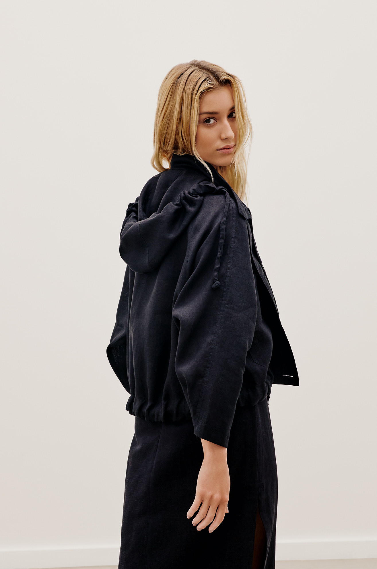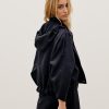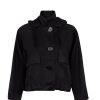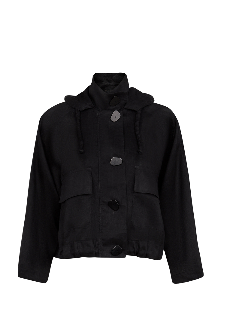 Jaqueta de gola alta com capuz ajustável com cordões. Bolsos em aba. Parte de baixo ajustável com cordões. Fecho frontal com zíper e botões de resina orgânica. Possui forro.