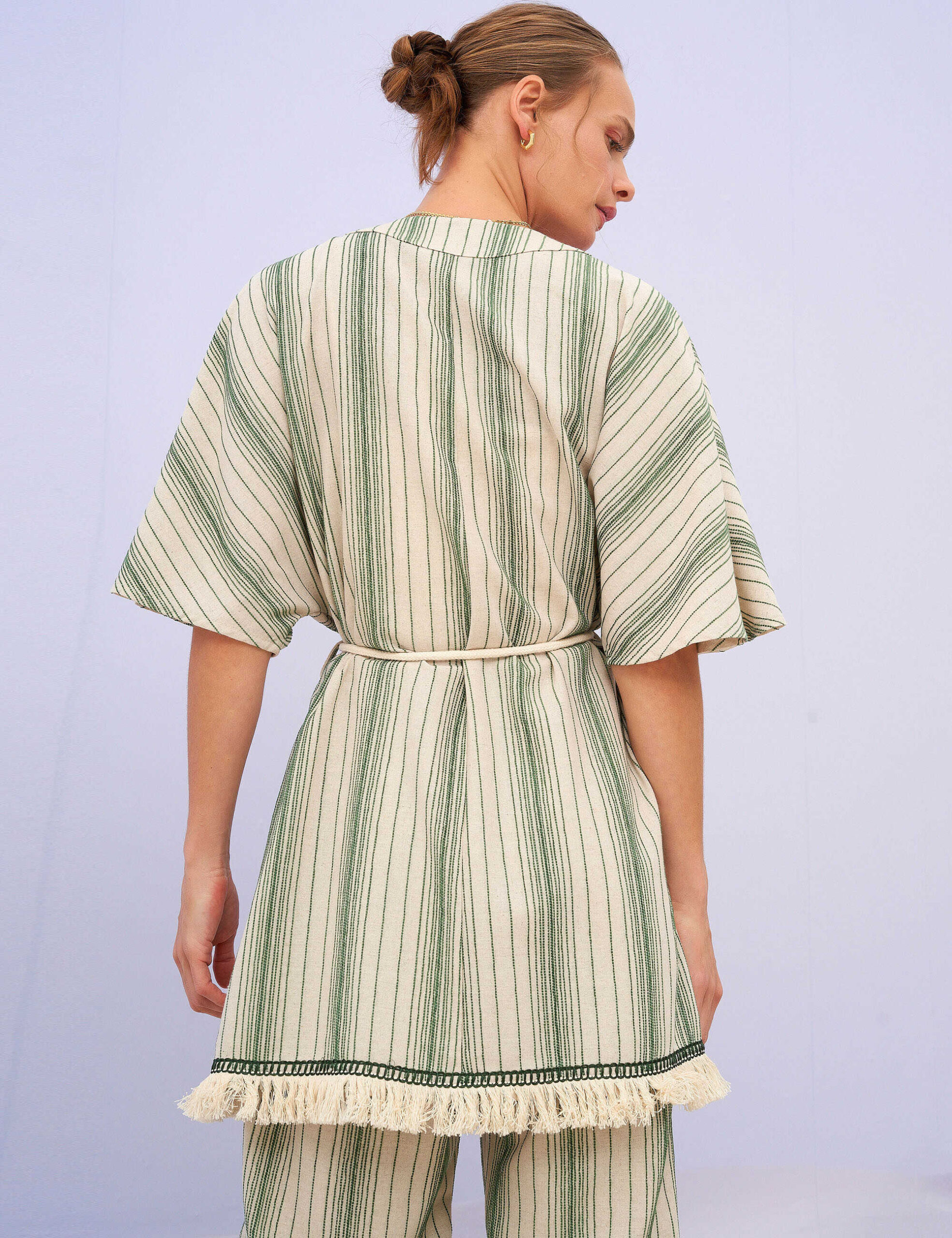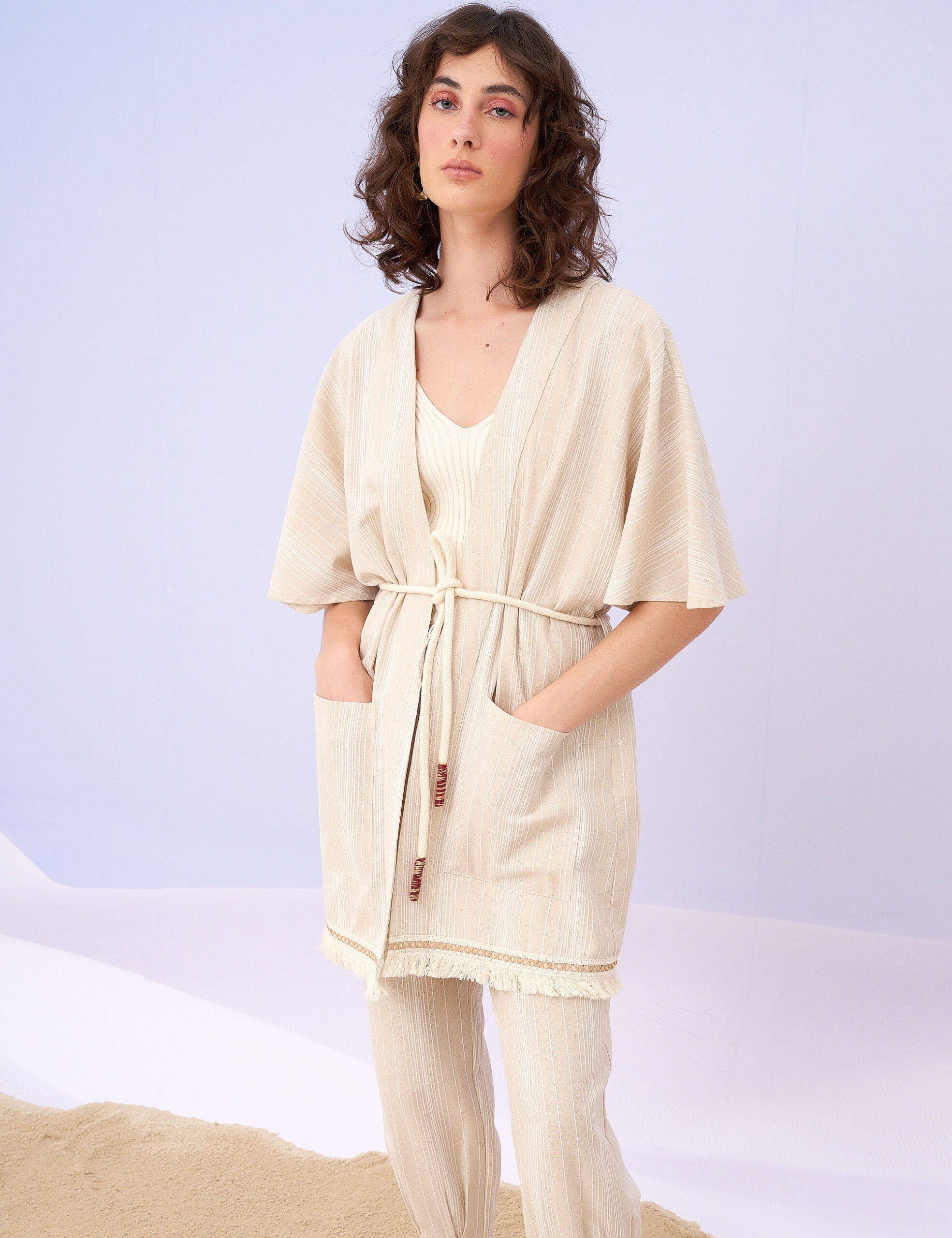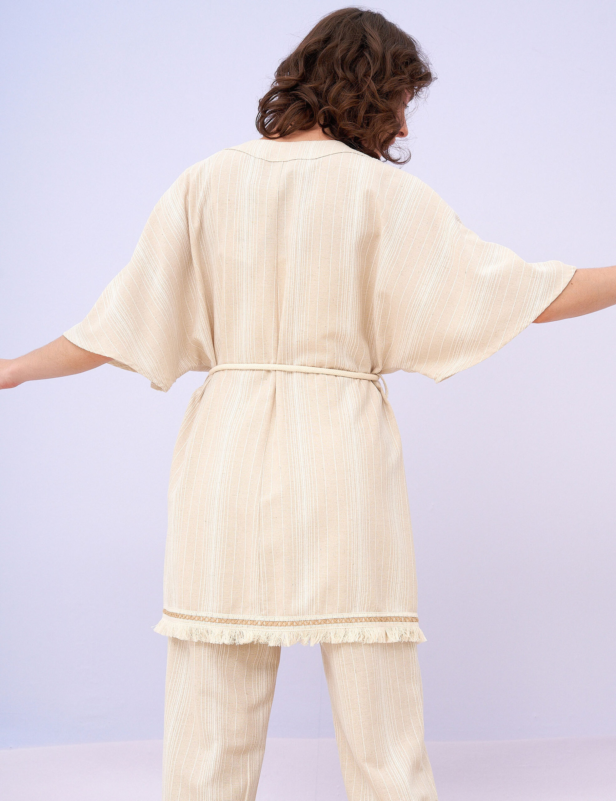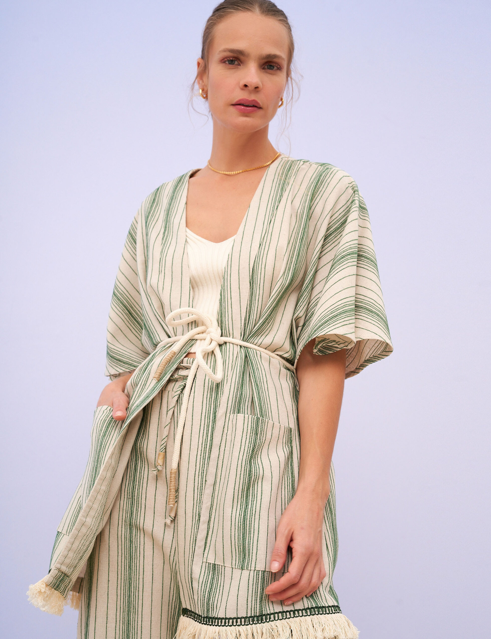 Kimono produzido em aspecto de linho, padronagem em listras, possui passantes aplicados, bolsos frontais na altura da cintura, caimento reto, shape solto, acabamento pespontado, barra desfiada, tamanho padrão com moderem regular, acompanha cinto de cordão com acabamento nas pontas.