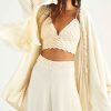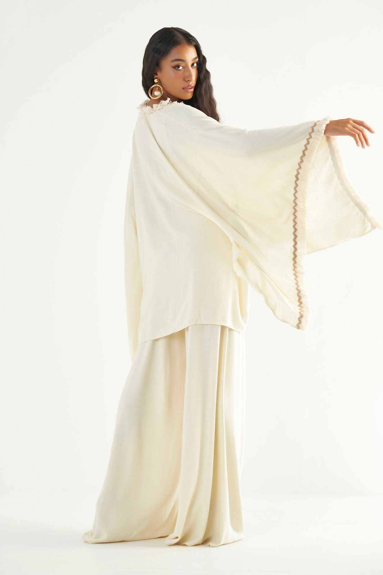 A peça possui mangas longas e amplas com aviamento aplicado e franja solta na barra, não possui fecho, aviamento e franja solta aplicados na barra, modelagem ampla, shape solto e caimento reto.