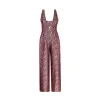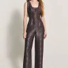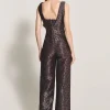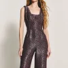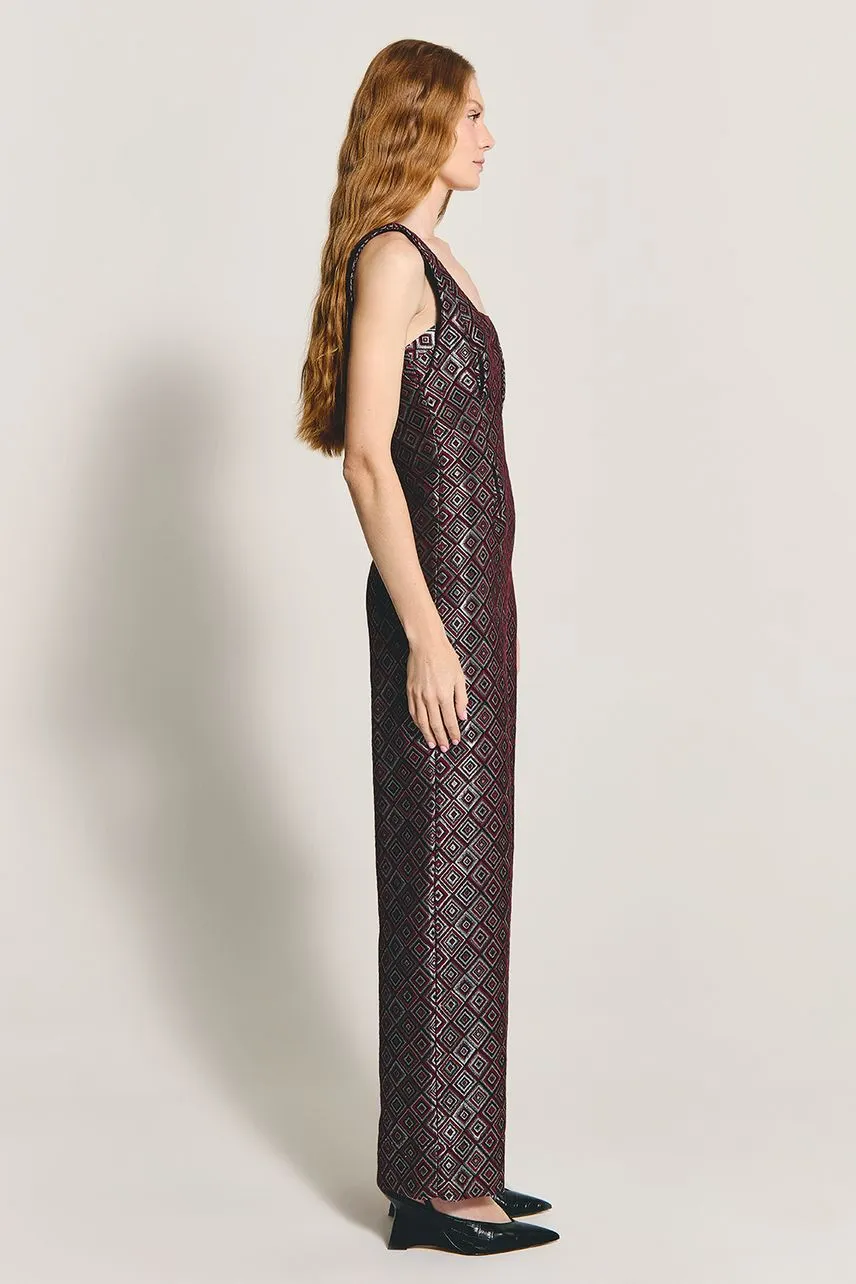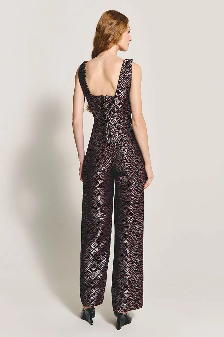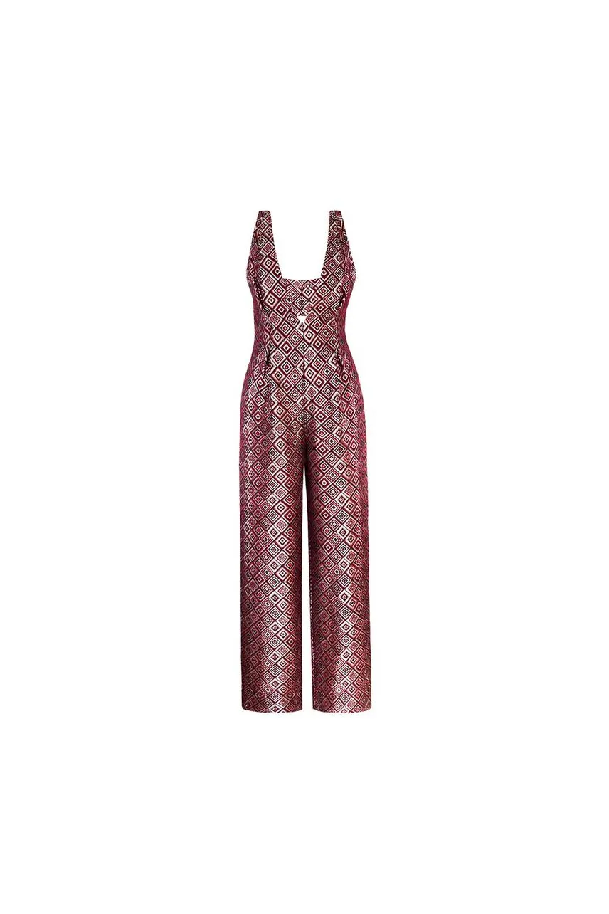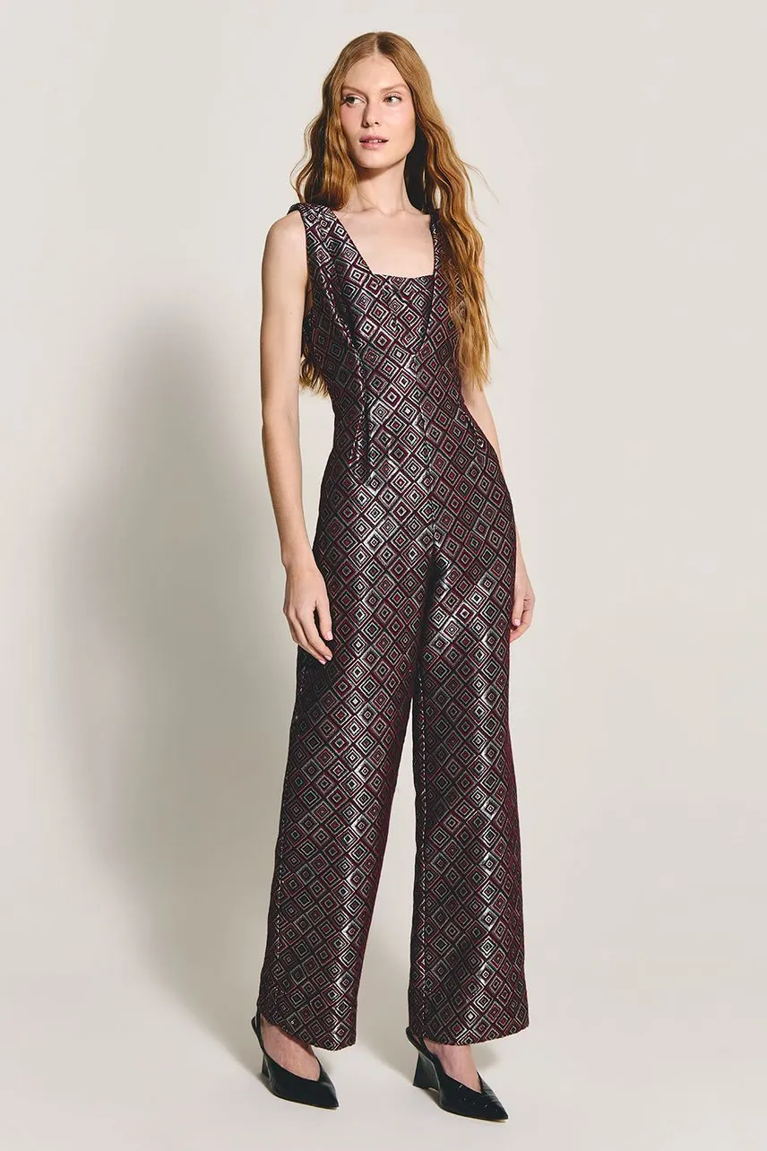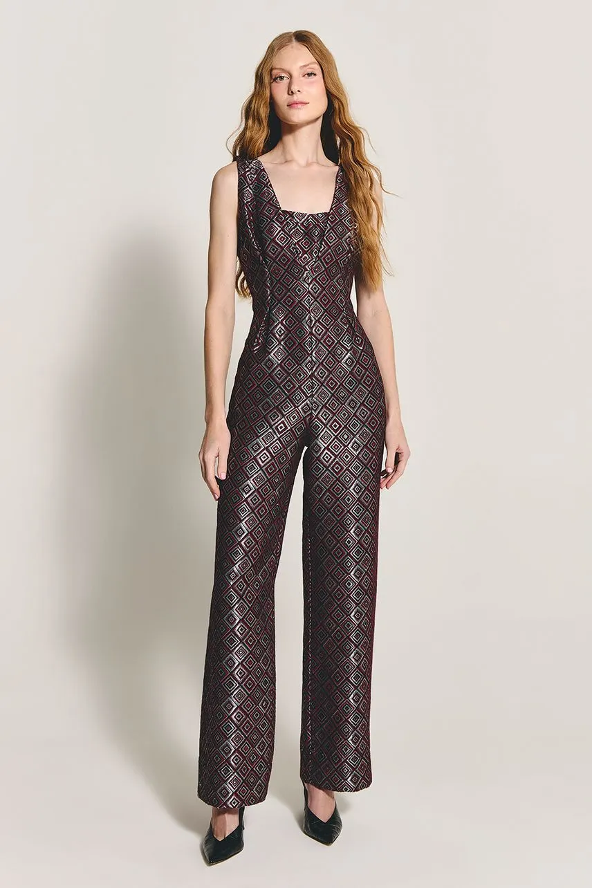 Macacão em jacquard com modelagem reta e corpo acinturado por pregas. Possui top avulso do próprio tecido e fechamento posterior por zíper de metal.