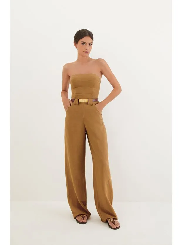 Em equilíbrio perfeito entre o moderno e atemporal, o macacão bege Iuna é uma peça para ter por diversas temporadas. Experimente usá-lo com sandálias, bolsas e outros acessórios ViX. – Detalhe imitando efeito clochard na cintura – Acompanha cinto no mesmo tecido com fivela de metal dourado – Sem alça – Decote reto – Recorte no busto e na calça – Bolsos – Zíper e lastex nas costas Detalhes feitos à mão no ateliê ViX