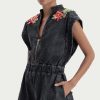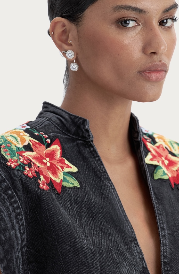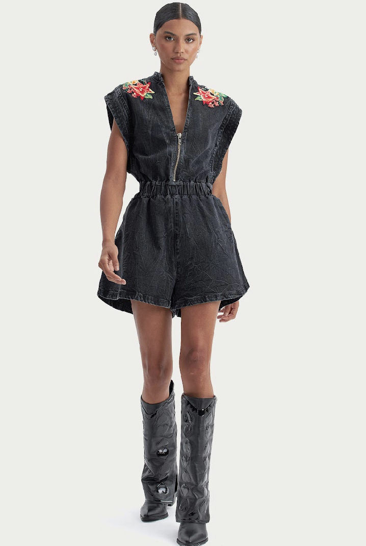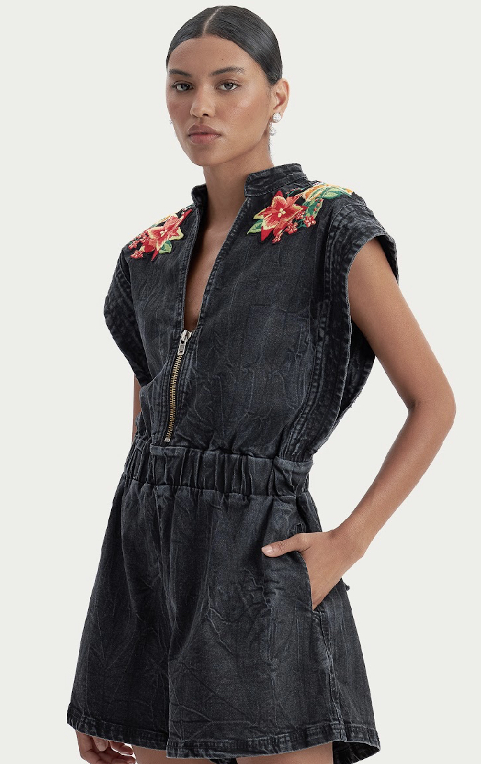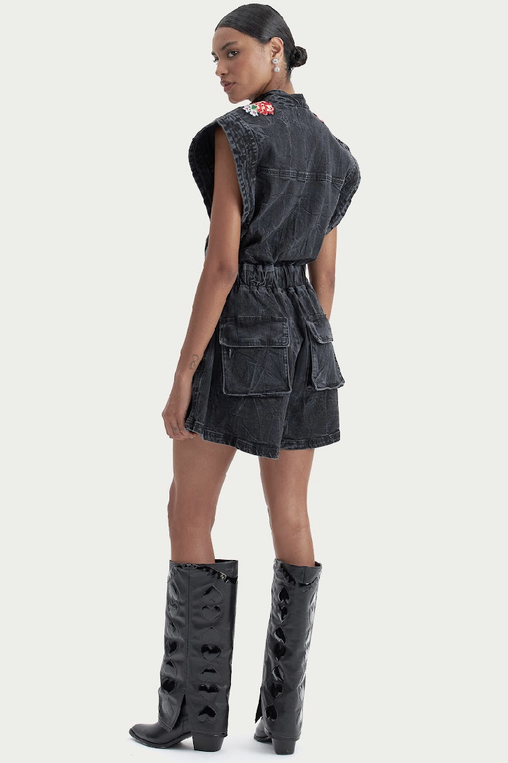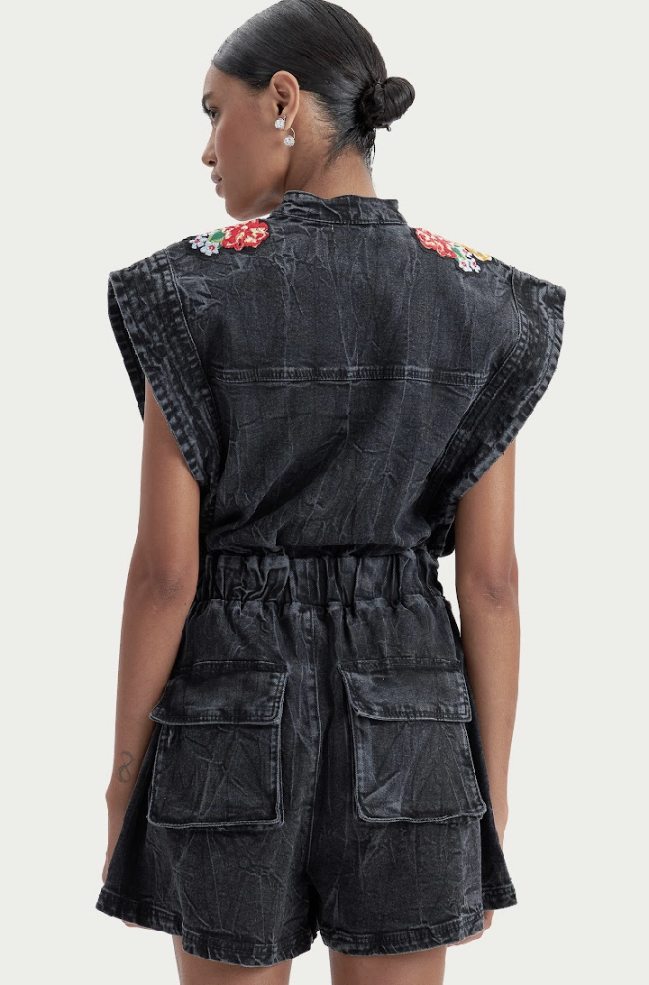 Macacao Jeans Curto Bordado Preto – Amar de Amarante