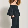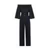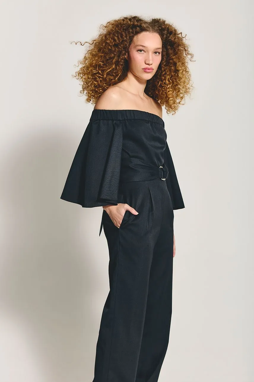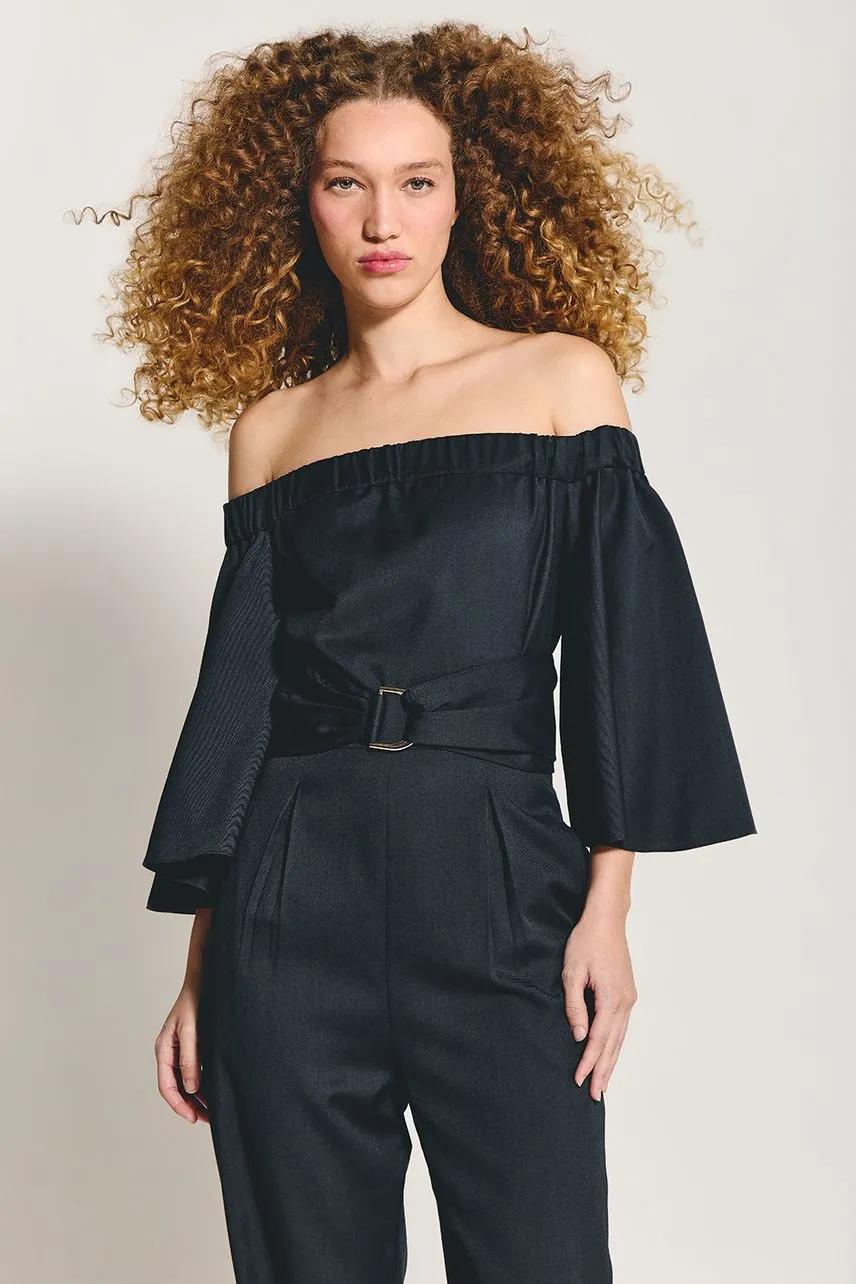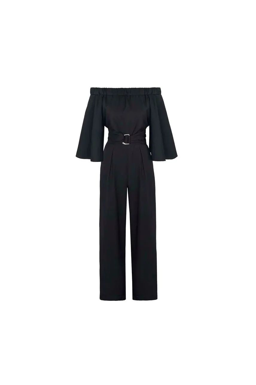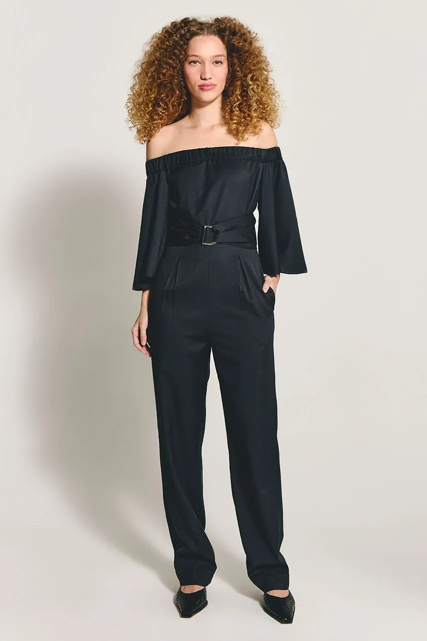 Macacão ombro a ombro em lã leve com modelagem regular. Possui cinto avulso do próprio tecido e fechamento posterior por zíper de metal.