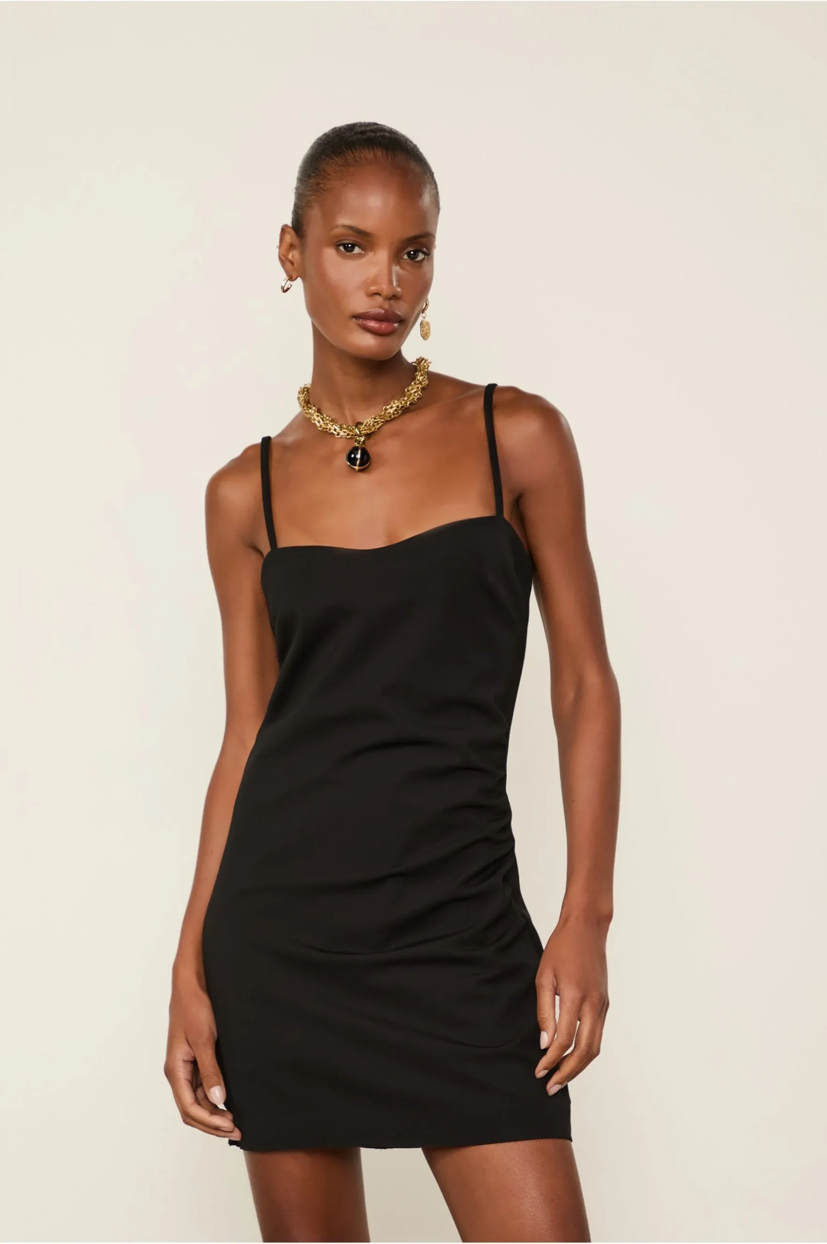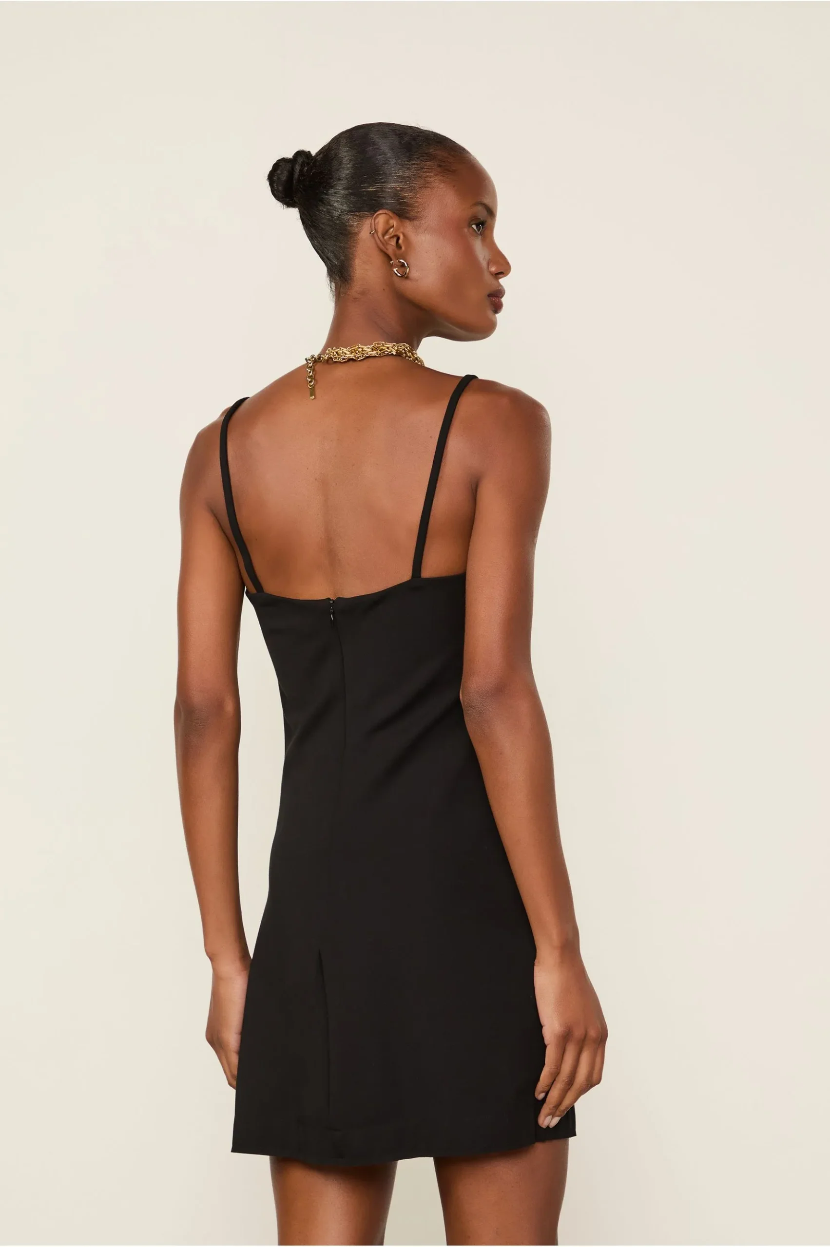 O Macacão Curto possui alças, franzido lateral e decote coração, além de fechamento por zíper e pence nas costas. Com um design que remete a um vestido mini, o modelo surge como uma proposta versátil, elegante e atemporal.