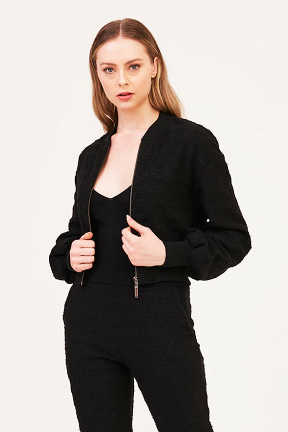 Novas texturas e cores vibrantes com um toque de brilho vão ganhar evidência nesta temporada! A Jaqueta Bomber confeccionada em tricot tweed com fio de lurex possui um brilho sutil e cheio de charme. Possui mangas longas com leve volume, comprimento cropped e fechamento por zíper frontal