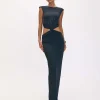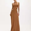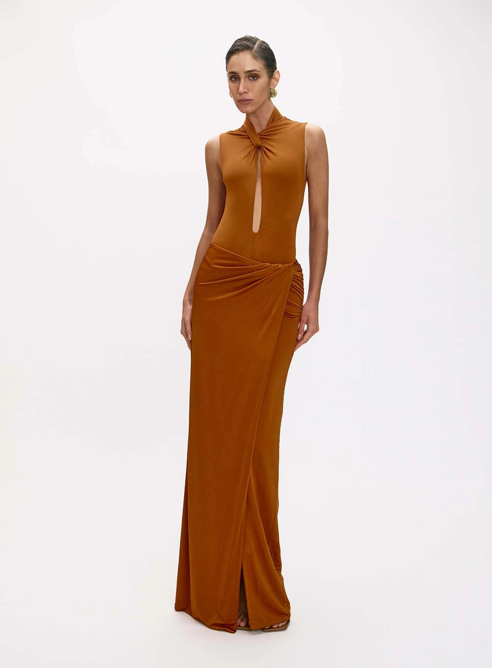 Body: Decote halter/gola alta com detalhe de nó frontal e recorte vazado (cut-out) sutil no busto, sem mangas, e ombros expostos.