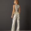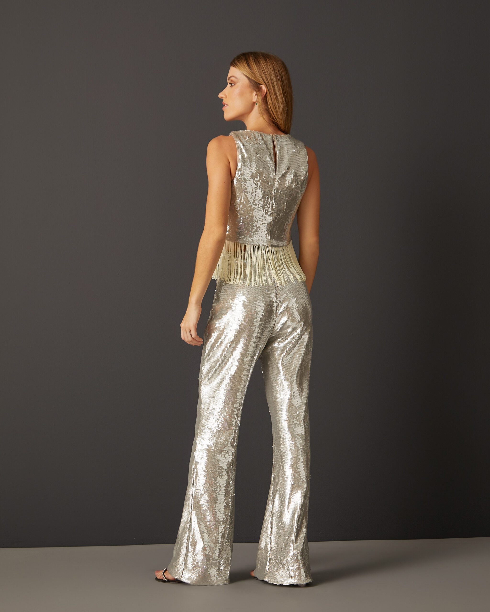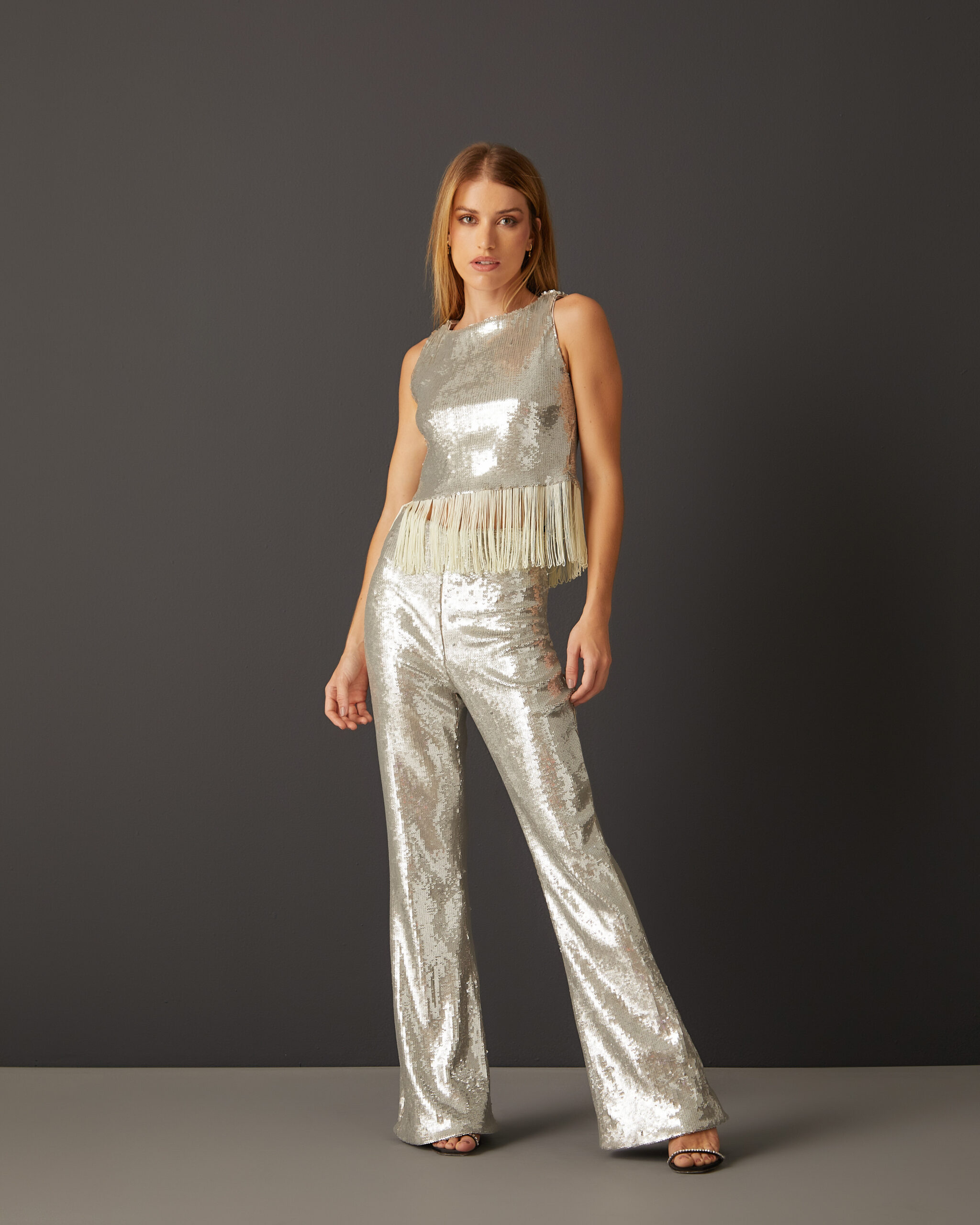 A blusa prata é confeccionada em tecido de paetês. A peça apresenta modelagem regata com aplicação de franjas off white na barra e textura de paetês, proporcionando um visual glam e sofisticado. Possui decote redondo, aspecto brilhoso, caimento levemente ajustado ao corpo e acabamento invisível. Fecho posterior por colchete metálico.