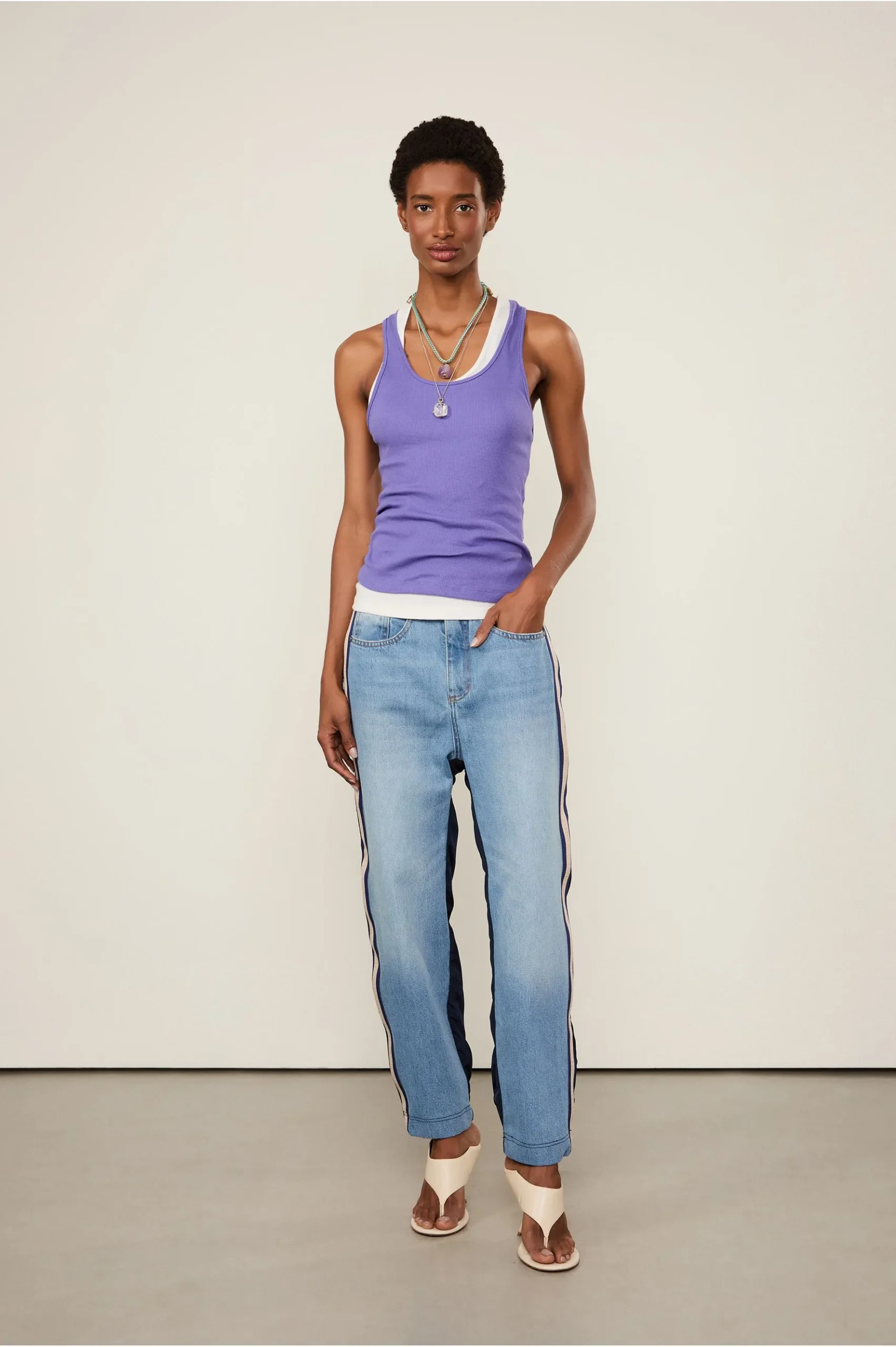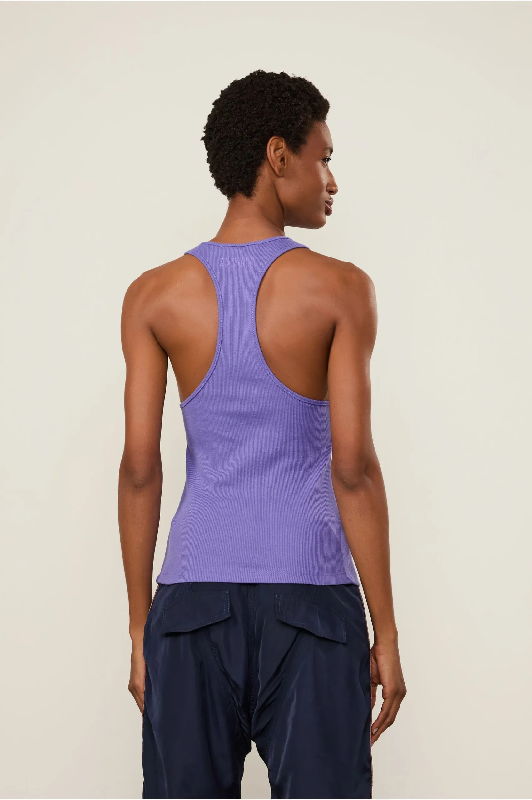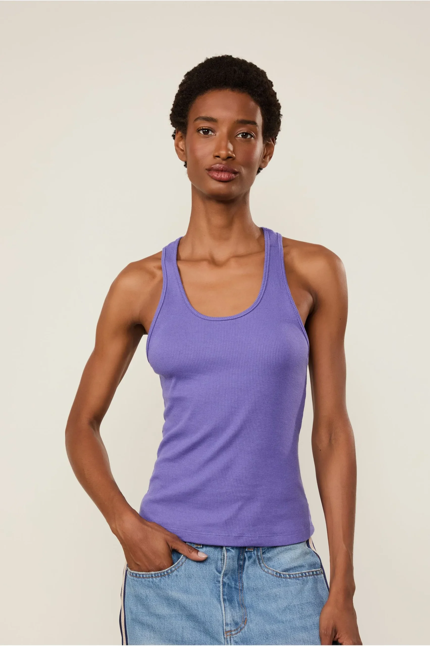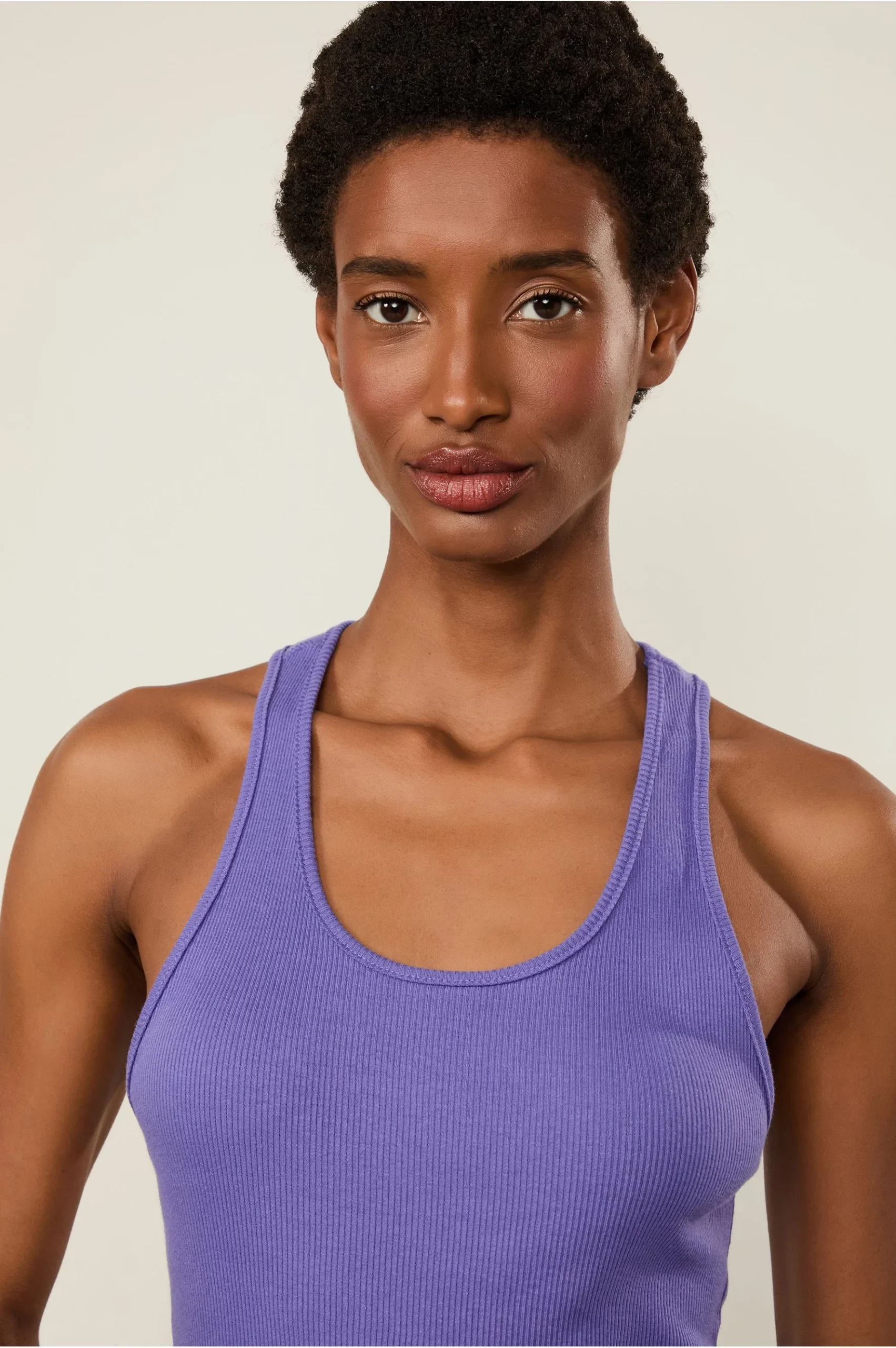A Regata de Malha Rib possui comprimento clássico, alças e decote em U nadador. Uma escolha versátil e atemporal.