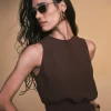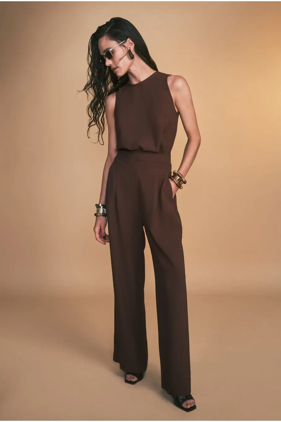 A regata Sara é confeccionada em crepe de alfaiataria. A peça apresenta modelagem solta, decote redondo com cava de regata, proporcionando um visual clássico e moderno. Possui comprimento médio, botão posterior para fechamento e acabamento pespontado.