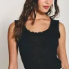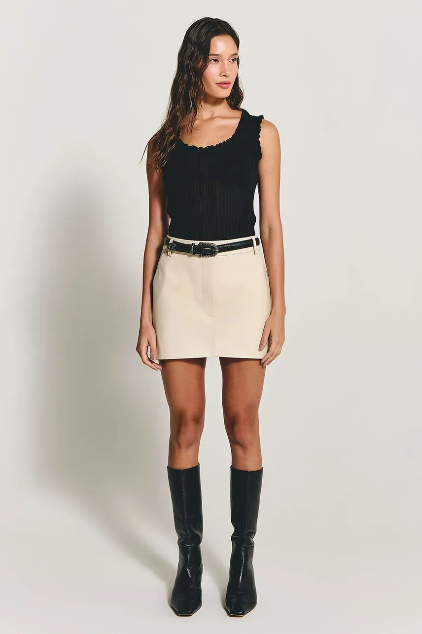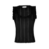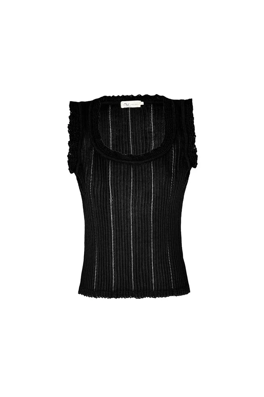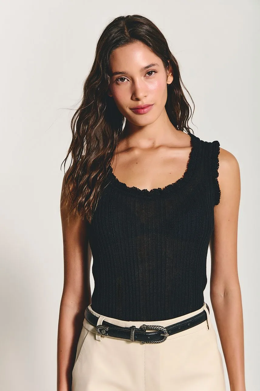 Regata em tricot leve com modelagem regular, decote arredondado e acabamento com frufru.