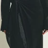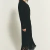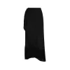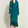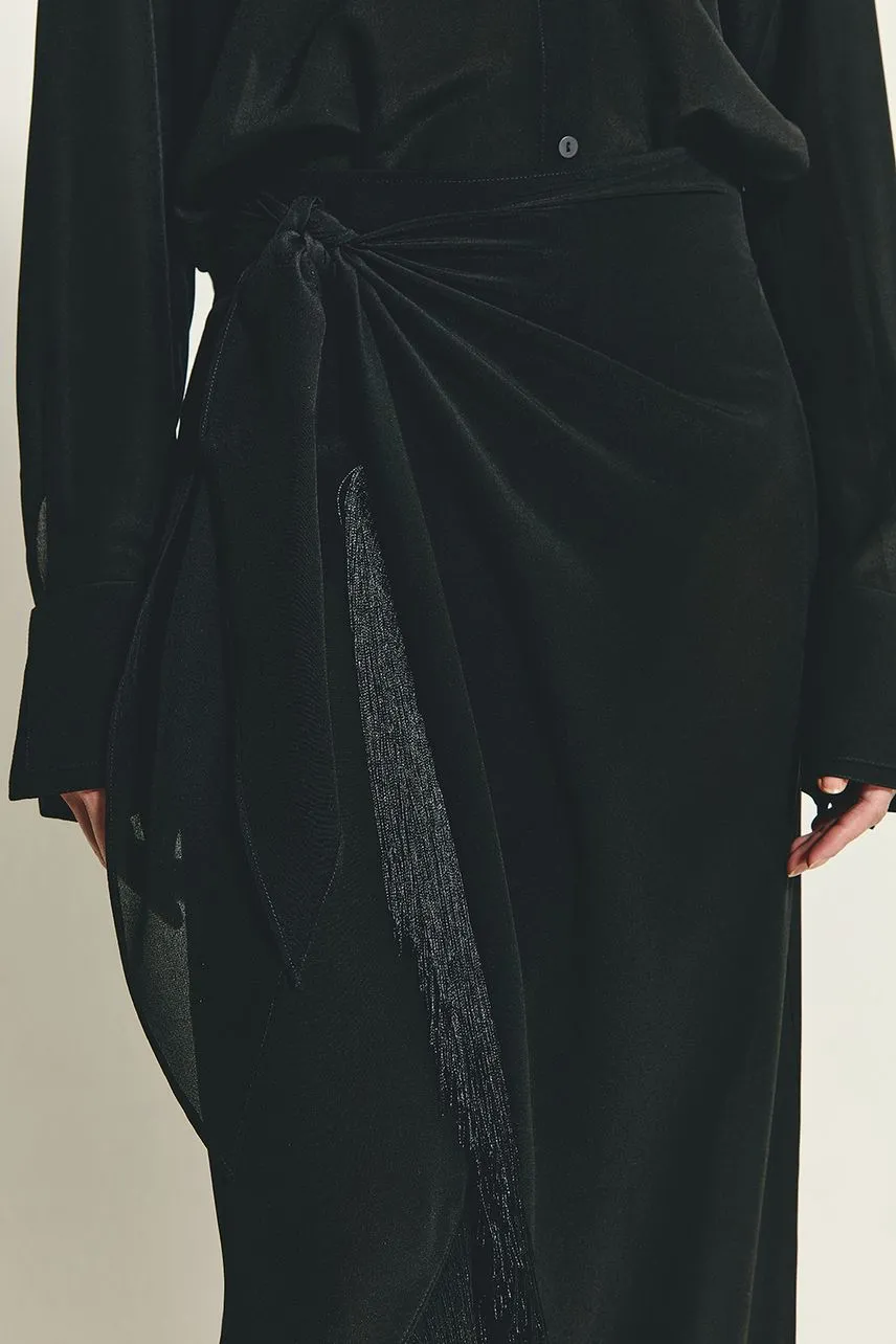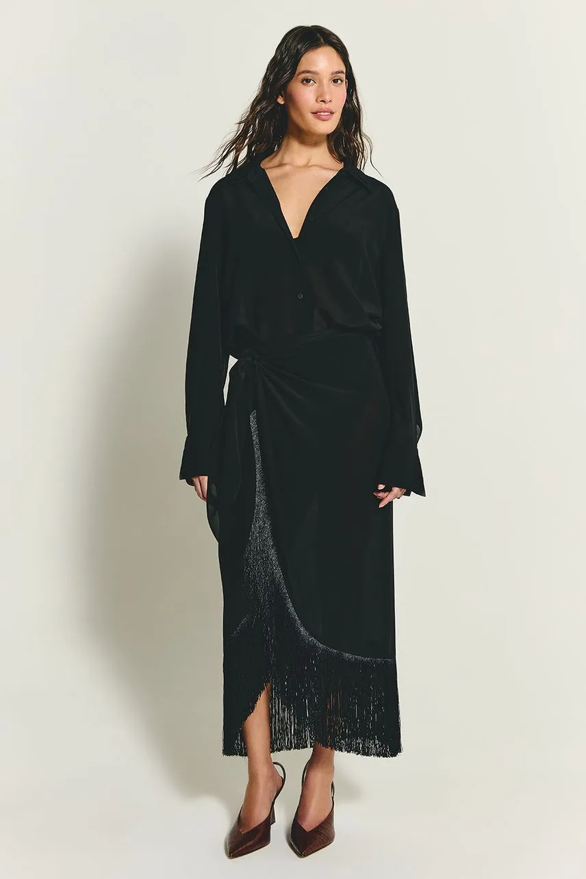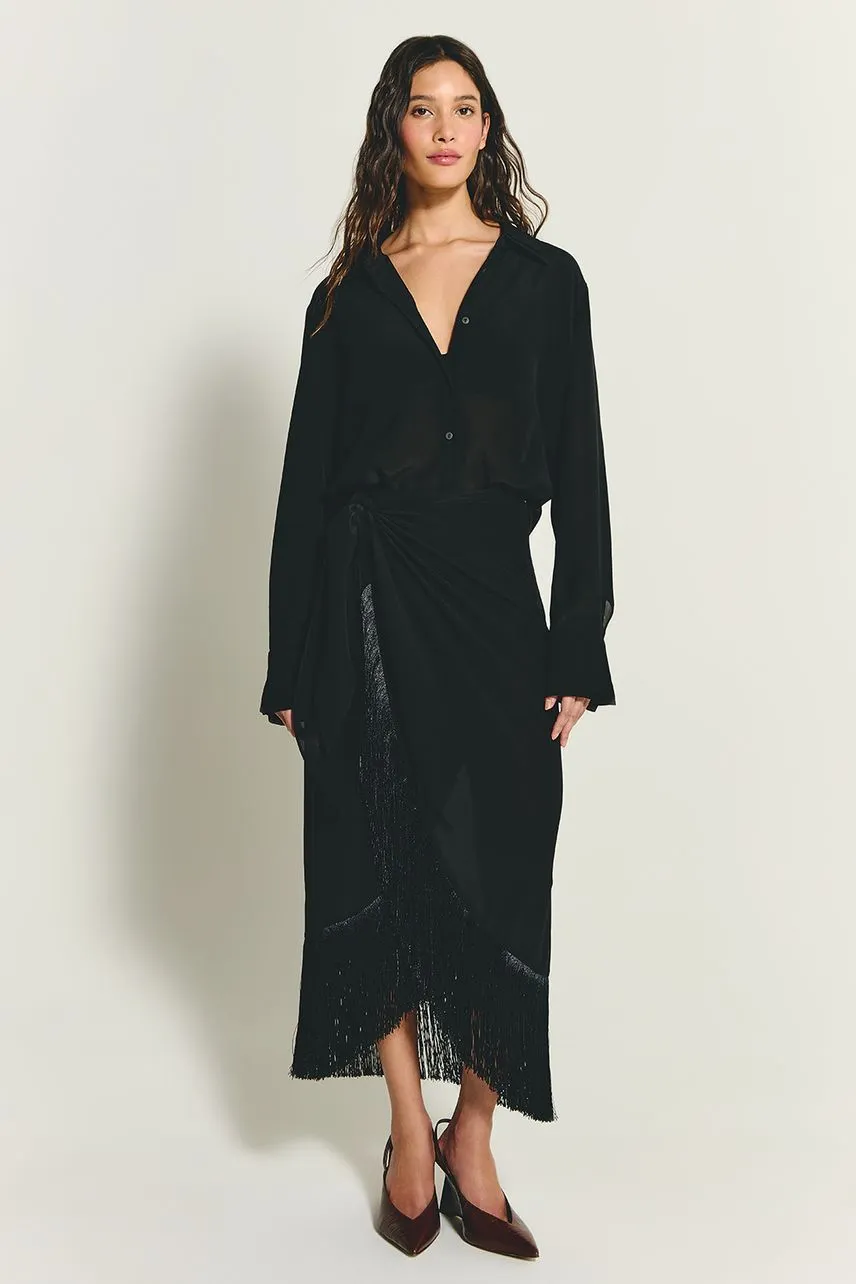 Saia midi cintura média em seda reta com transpasse lateral e franjas na barra. Possui fechamento por amarração lateral.