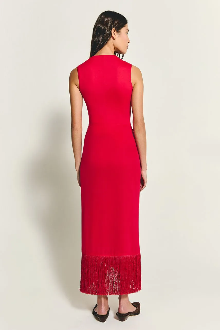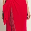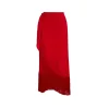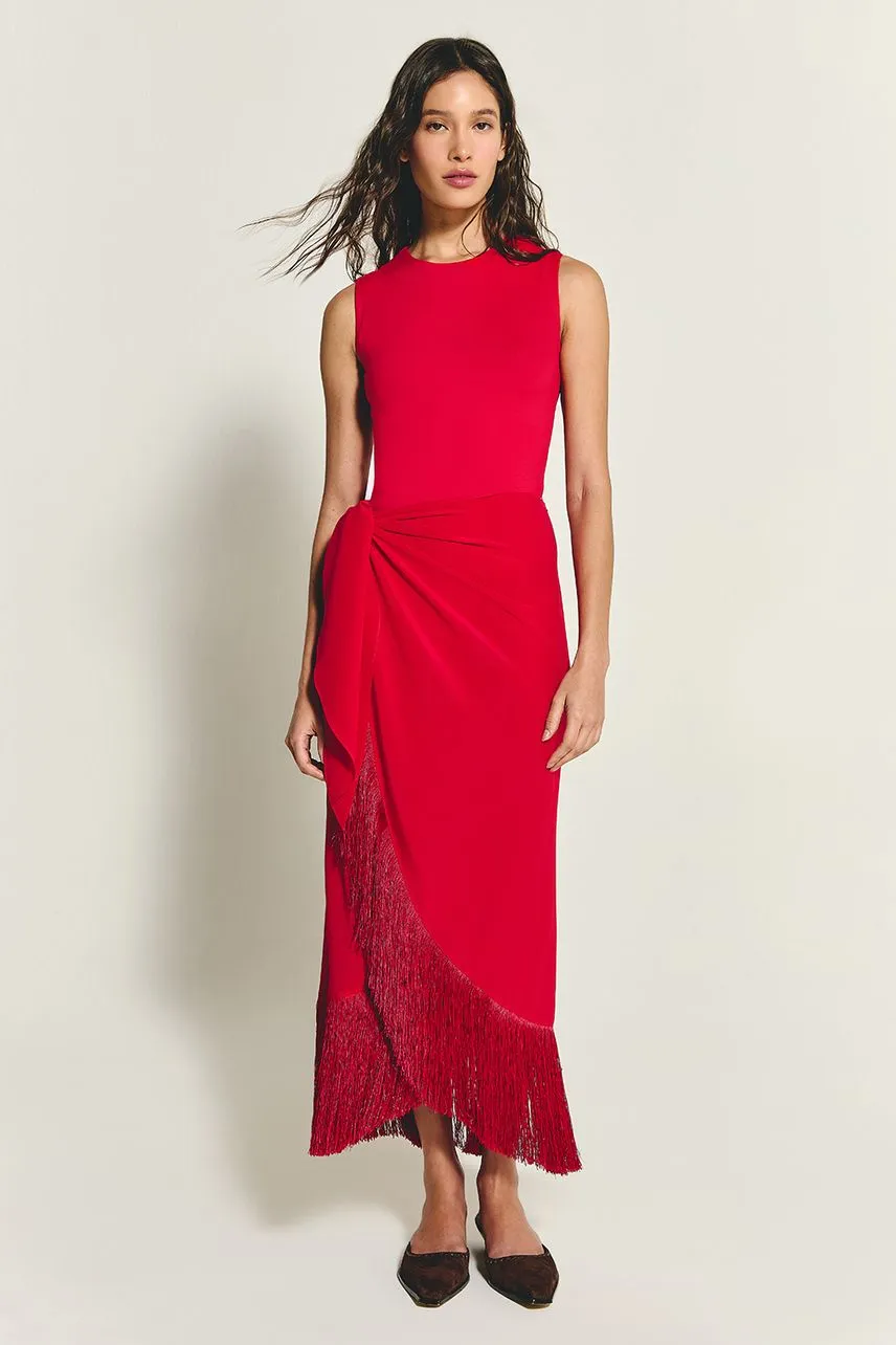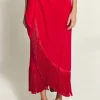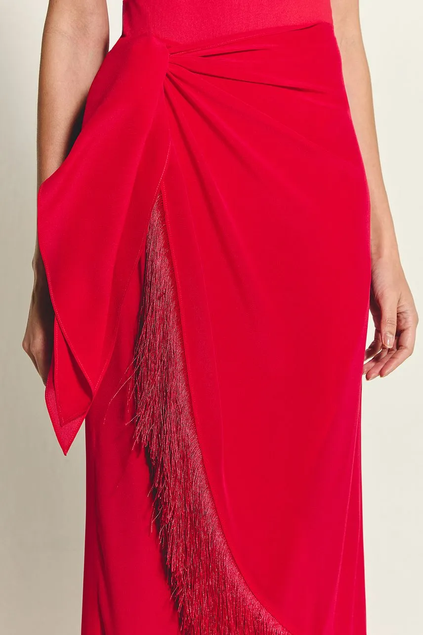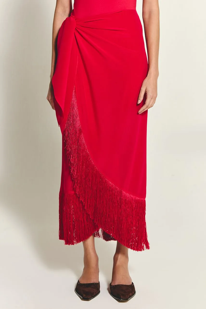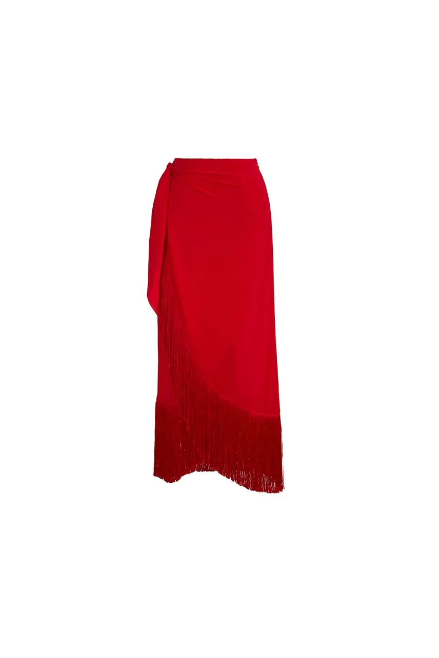Saia midi cintura média em seda reta com transpasse lateral e franjas na barra. Possui fechamento por amarração lateral.