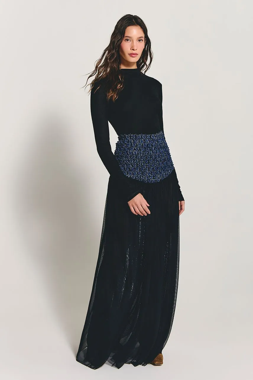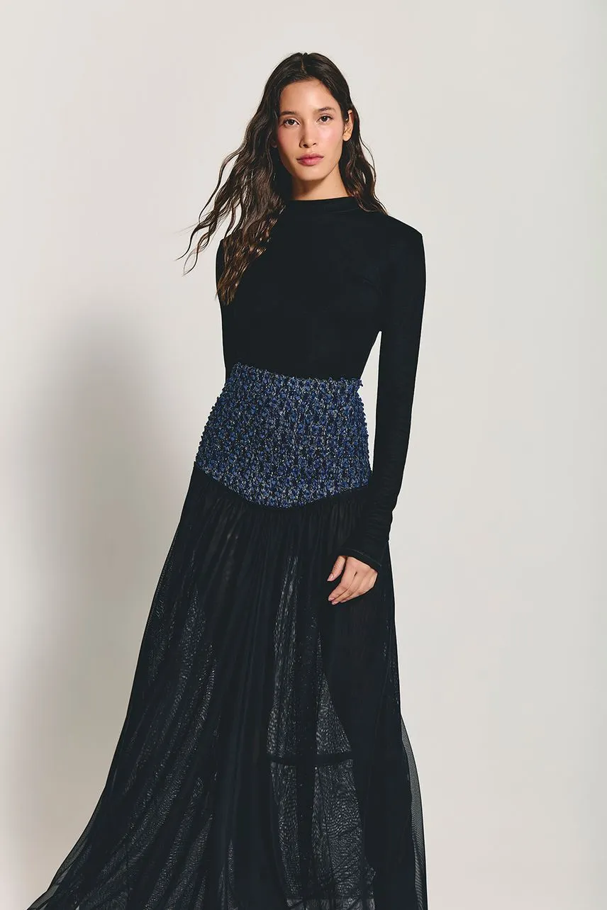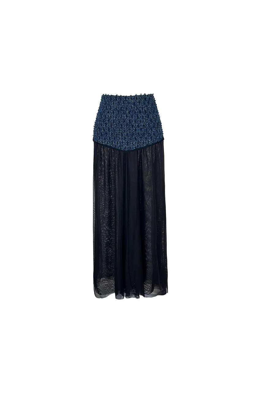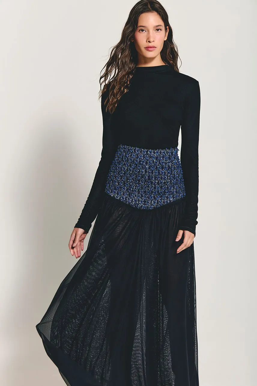 Saia com pala de malha tweed e comprimento em tule franzido. Possui forro de tule e fechamento posterior por zíper invisível.