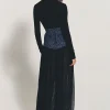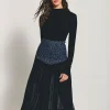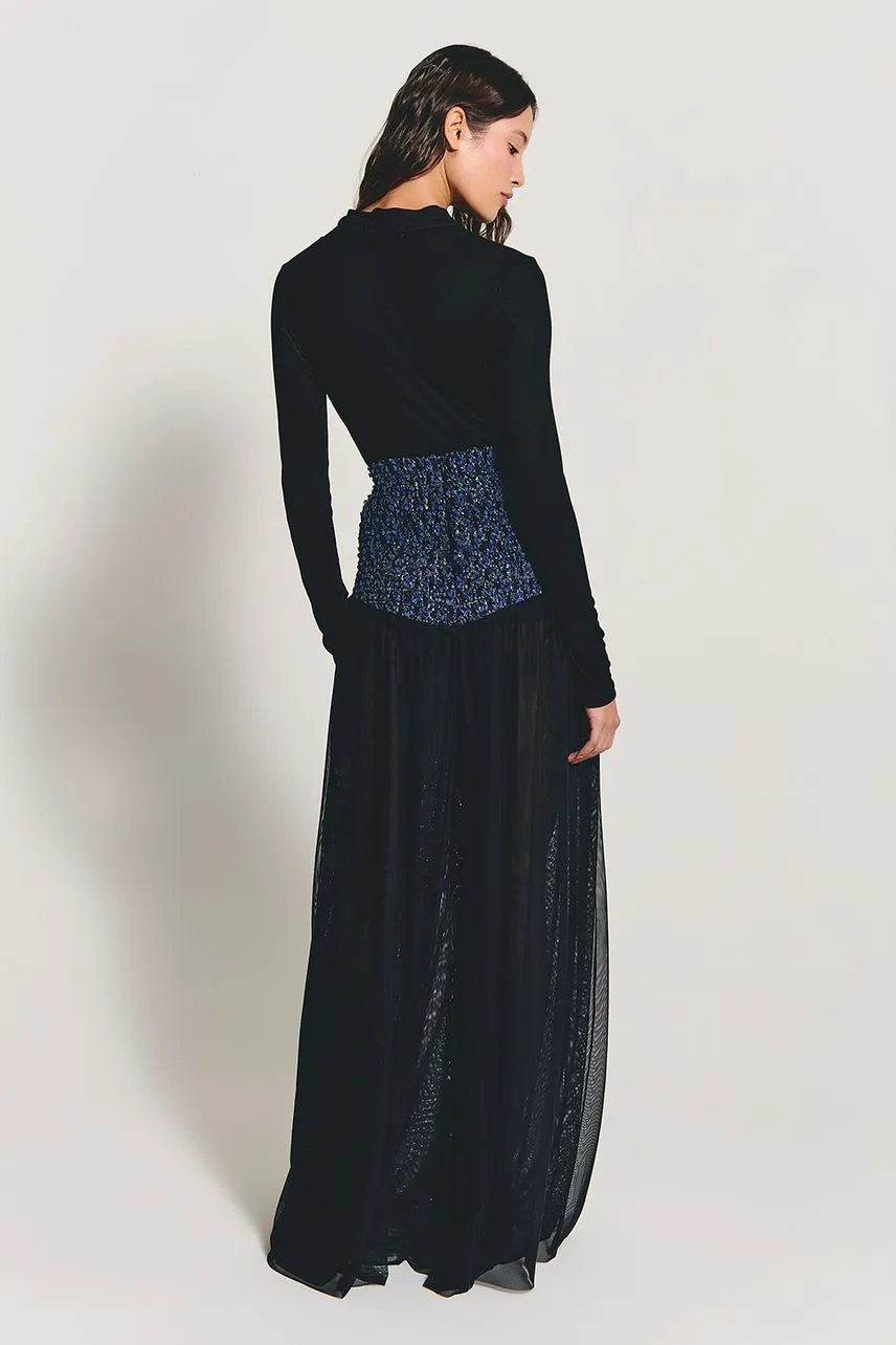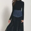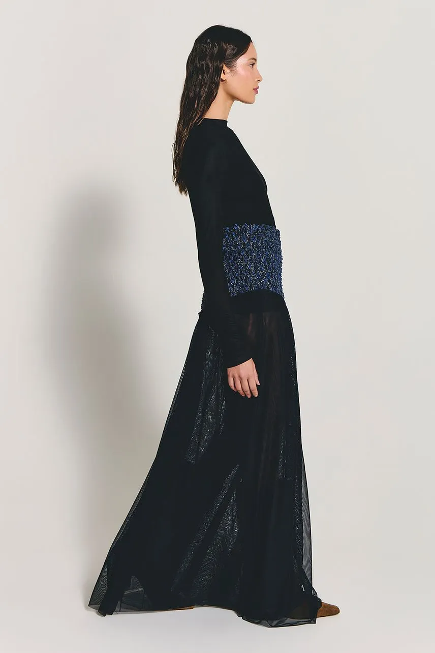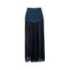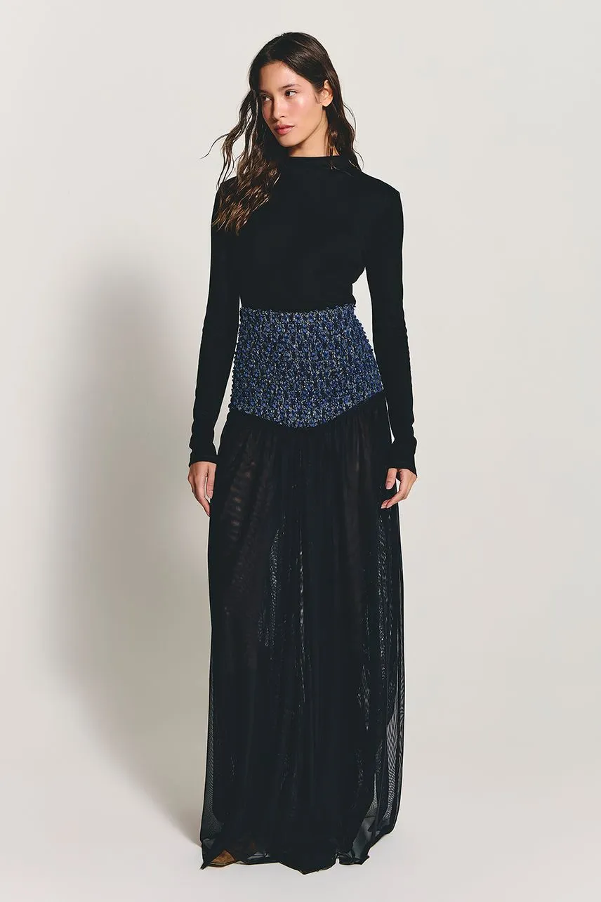 Saia com pala de malha tweed e comprimento em tule franzido. Possui forro de tule e fechamento posterior por zíper invisível.