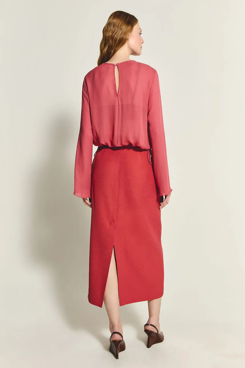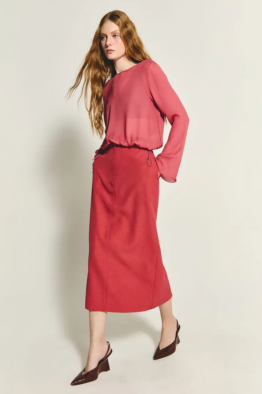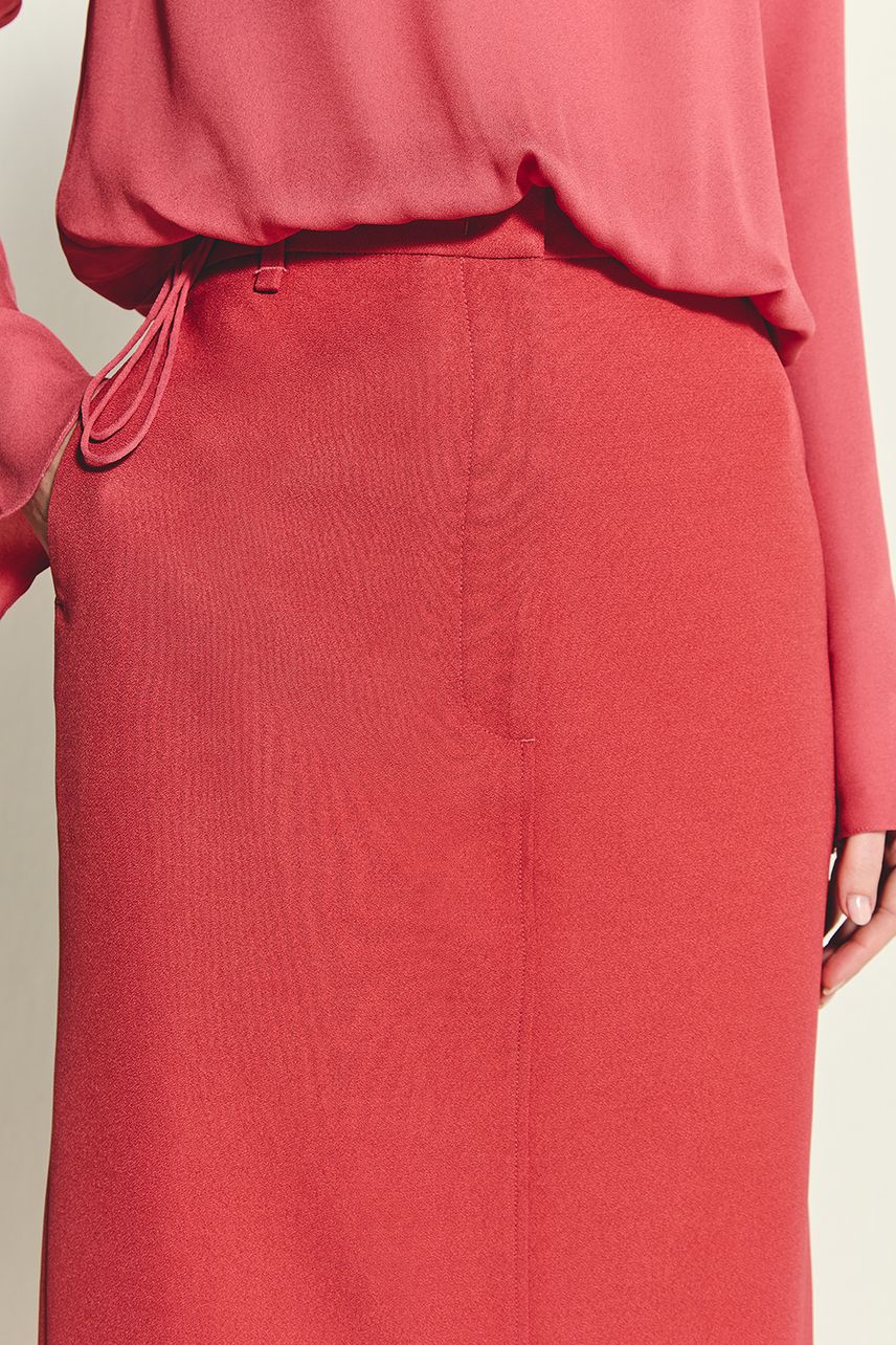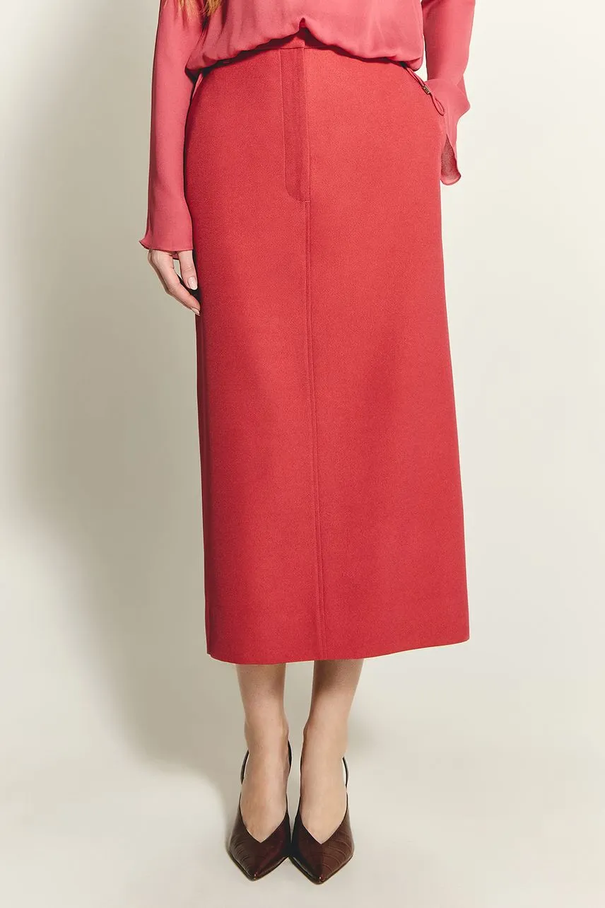 Saia midi em crepe de acetato com modelagem reta e cintura média. Possui bolsos faca frontais e fechamento por gancho e zíper.