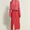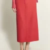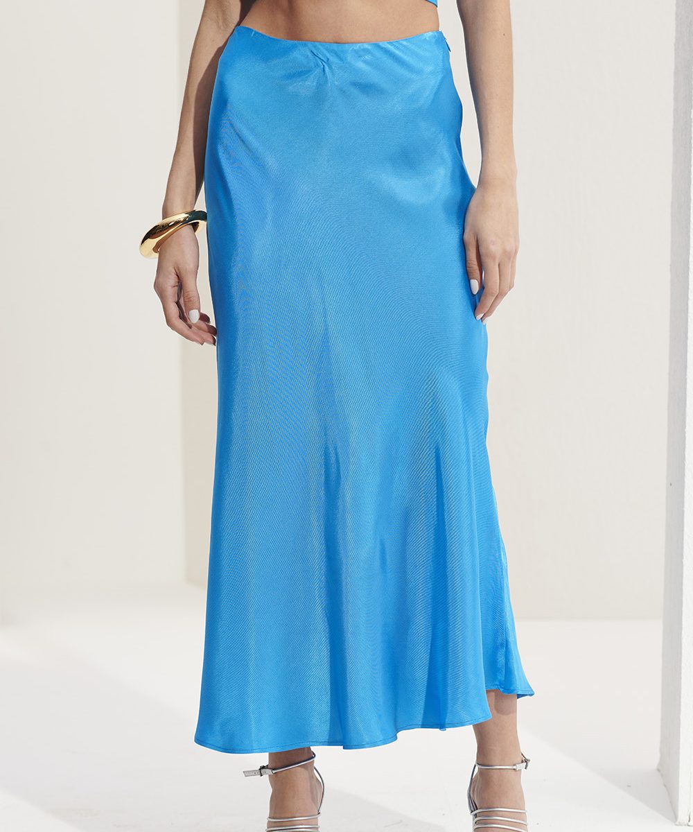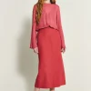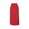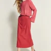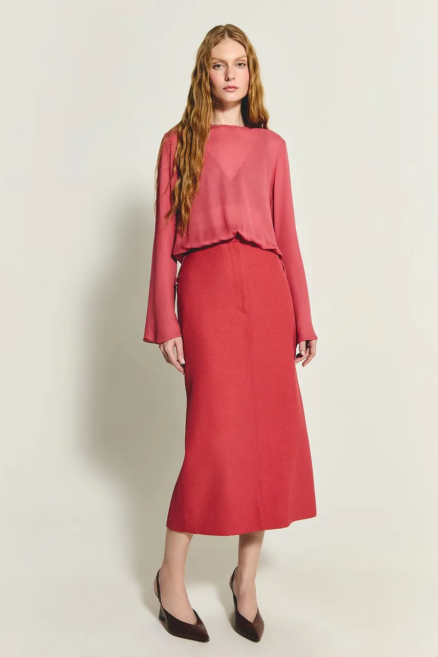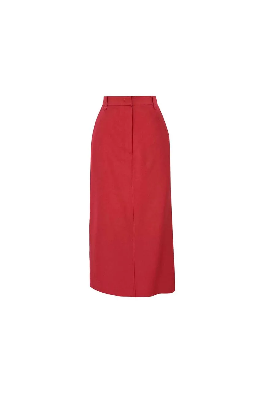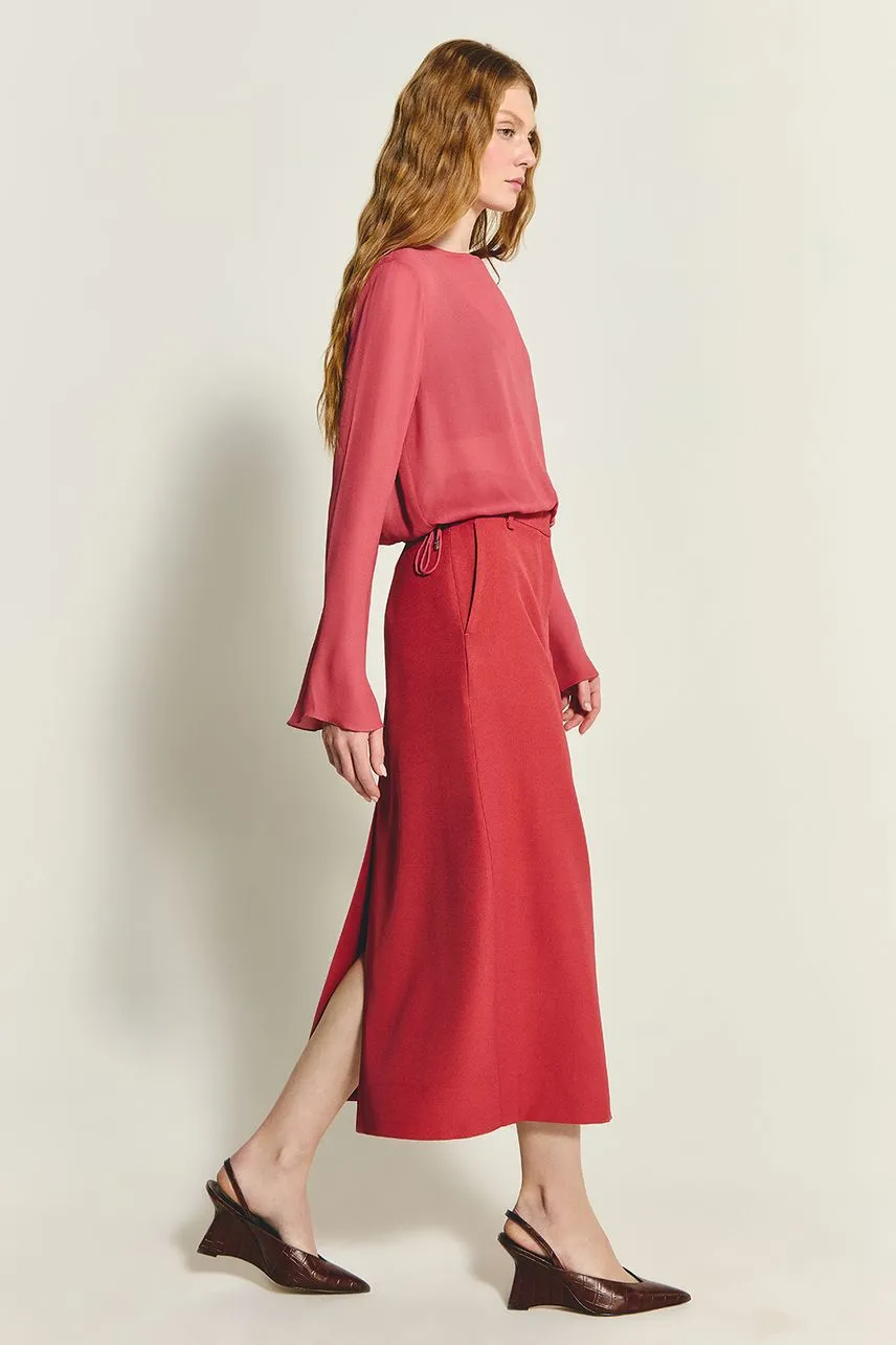 Saia midi em crepe de acetato com modelagem reta e cintura média. Possui bolsos faca frontais e fechamento por gancho e zíper.