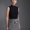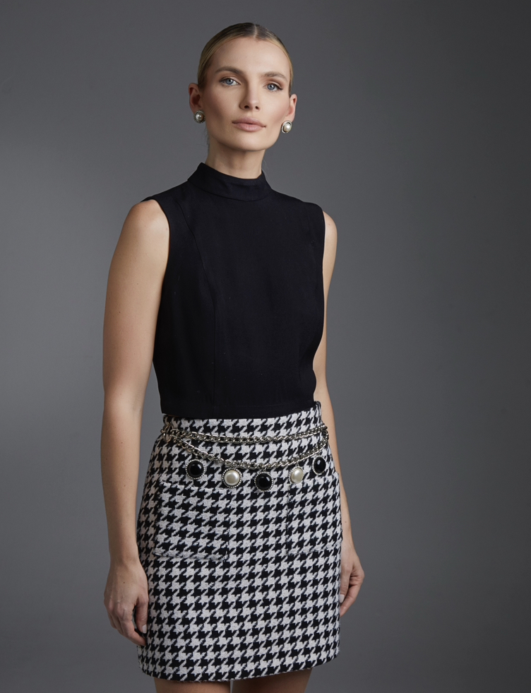 A saia Gabriele é confeccionada em tweed com a padronagem pied de coq. A peça apresenta modelagem justa e dois bolsos anterior, proporcionando um visual moderno e clássico. Possui comprimento curto, cintura alta, forro embutido, zíper invisível lateral e acabamento pespontado. É recomendado cuidado ao lavar a peça, por se tratar de um tecido delicado.