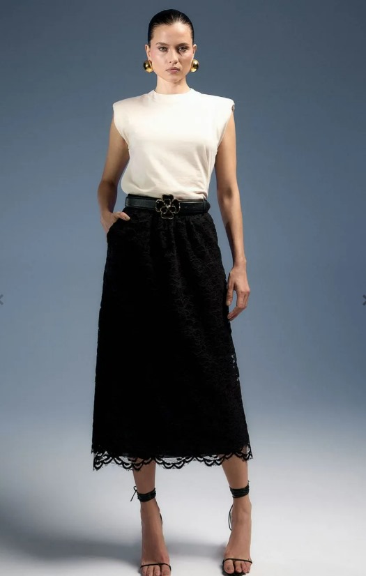 A saia Juliana é confeccionada em renda. A peça apresenta modelagem reta e leve transparência, proporcionando um visual elegante e atemporal. Possui comprimento midi, forro, fechamento por zíper.