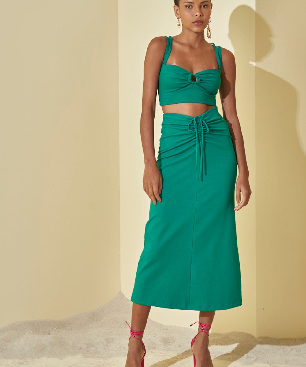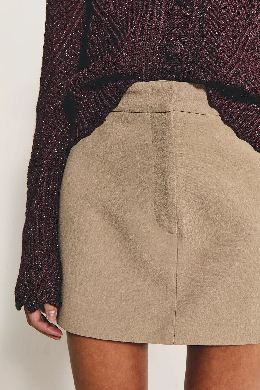 Saia de alfaiataria curta confeccionada em crepe de acetato, com modelagem reta e cintura média, perfeita para montar um look despojado e versátil. A peça conta com bolsos faca frontais e bolsos besom na parte de trás, trazendo um toque de elegância. Fechamento frontal por gancho e zíper, que garante um ajuste seguro e discreto.