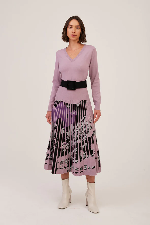 A saia plissada em tricot ganha destaque nesta coleção com a padronagem flower, uma exclusividade Viviane Furrier, feita em jacquard. A peça possui comprimento midi e tricot estruturado que não marca o corpo.