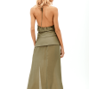 Saia com pala larga drapeada na cintura (mais ajustada), e soltinha na parte de baixo. Fenda do lado esquerdo, na frente. Zíper nas costas. Forro.