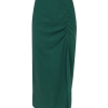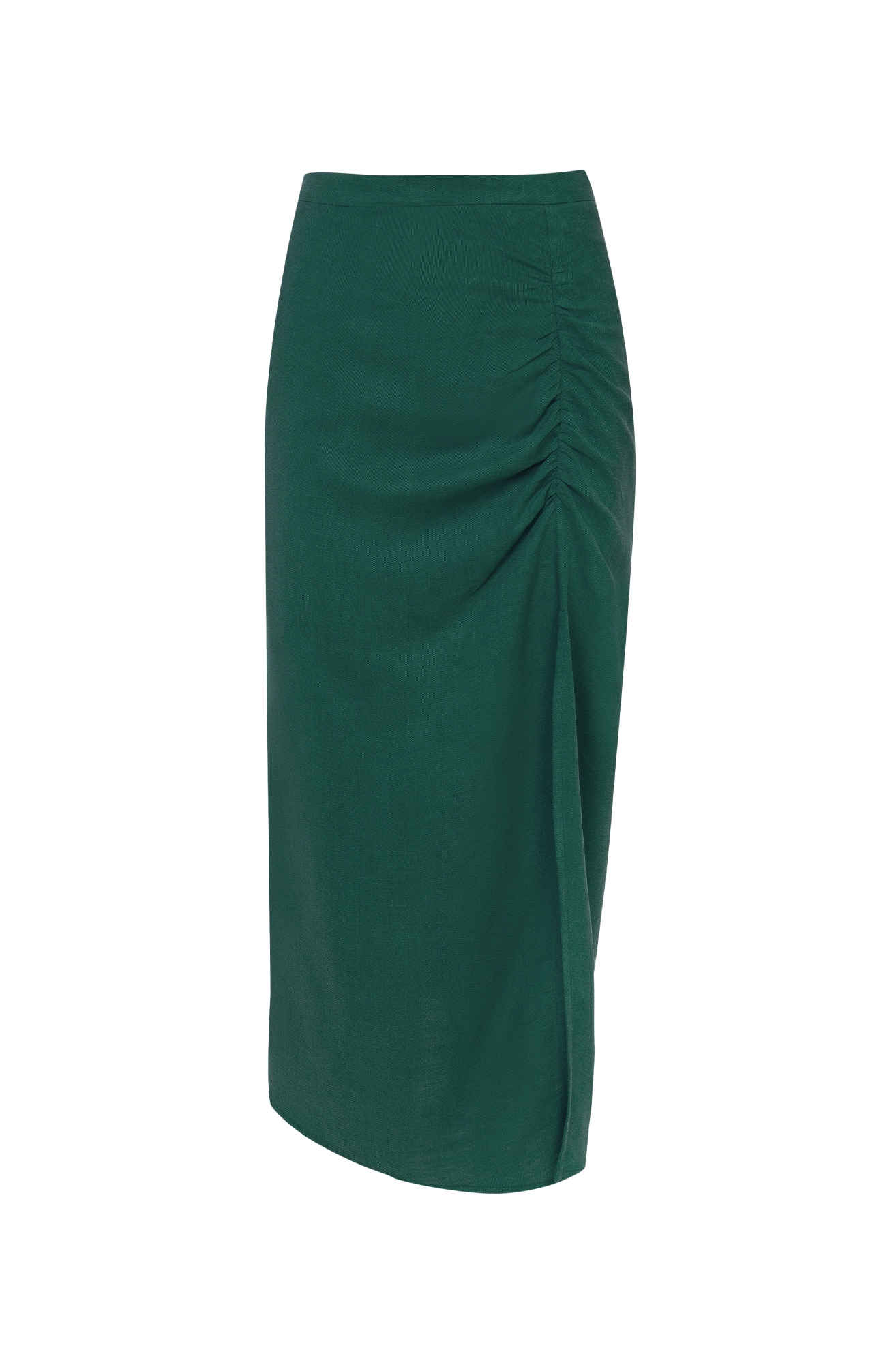 Acima da fenda, na vertical até o cós, recorte fino com efeito levemente franzido.