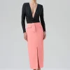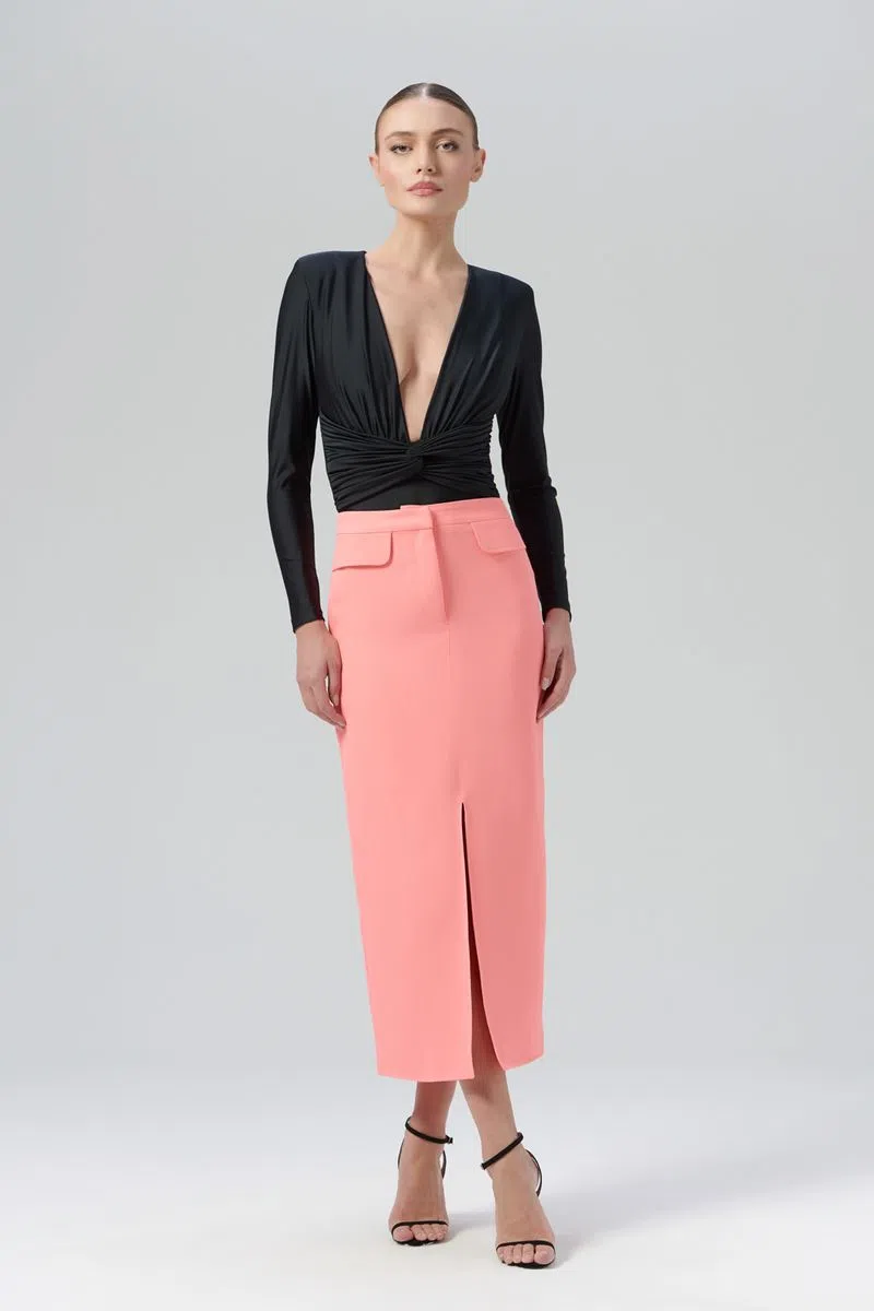 A saia Nancy é confeccionada em alfaiataria. A peça apresenta modelagem reta com fenda ao meio anterior, proporcionando um visual moderno e elegante. Possui comprimento longuete, cintura média, acabamento pespontado, fechamento por zíper de nylon e colchete de metal.