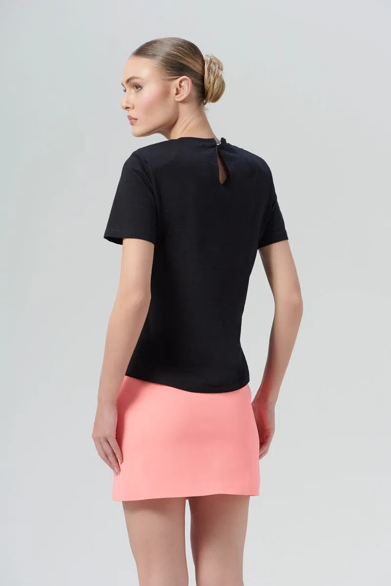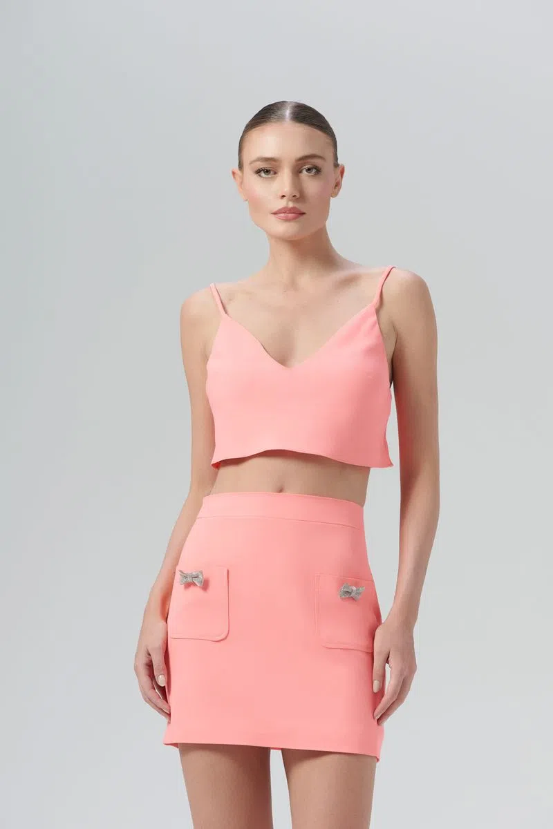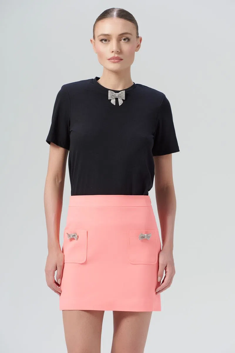 A saia Rosie é confeccionada em alfaiataria. A peça apresenta modelagem justa com bolsos anterior com detalhe de lacinho revestido em brilho, proporcionando um visual moderno e fashion. Possui comprimento curto, cintura média, forro embutido, zíper invisível posterior e acabamento pespontado. Peça com detalhes delicados, recomenda-se cuidado ao lavar.