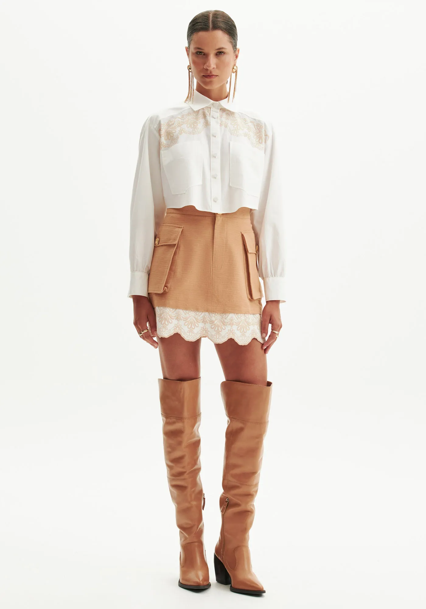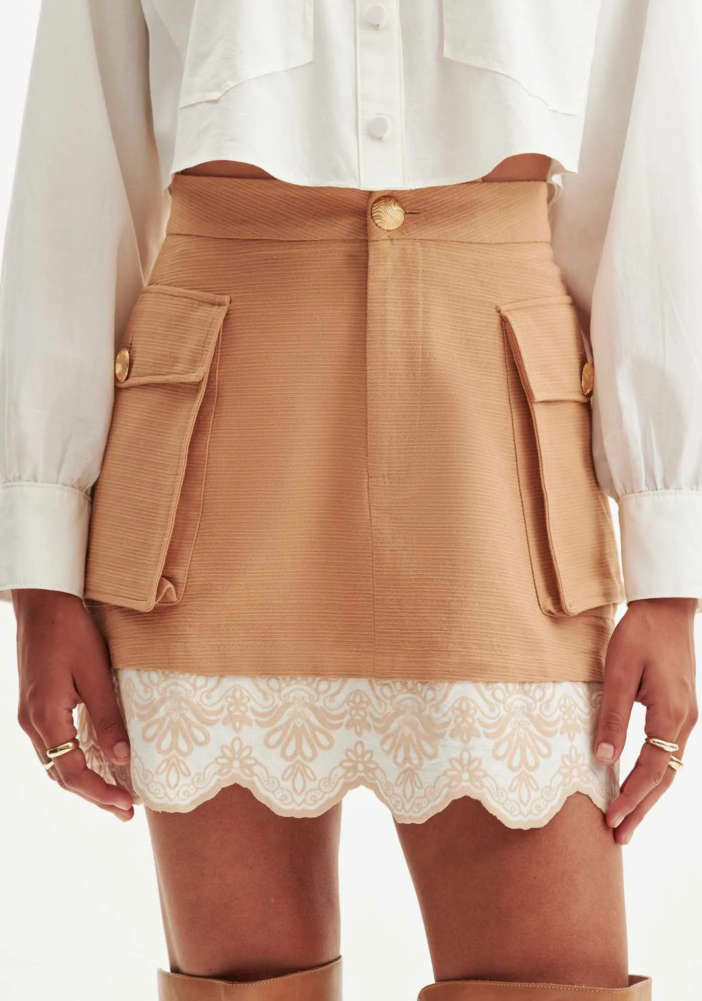A saia curta feminina inspira personalidade. Possui bolsos funcionais e fechamento frontal por zíper e botão. Os detalhes delicados da barra se juntam à autenticidade do utilitarismo para compor looks estilosos e sofisticados. Invista!