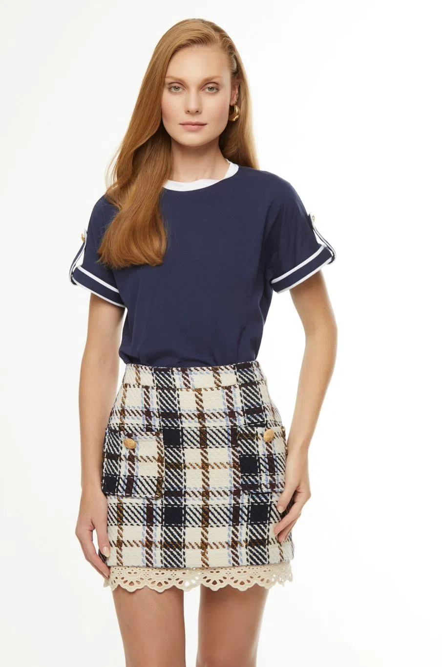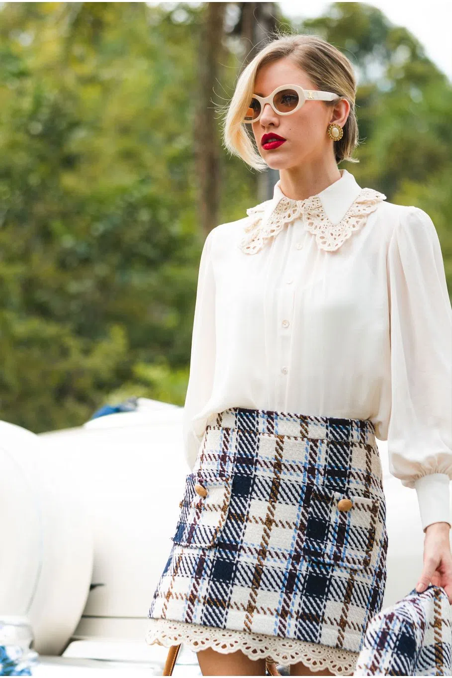 A saia Vitória é confeccionada em tweed xadrez. A peça apresenta modelagem justa com detalhes de laise na barra, proporcionando um visual moderno e sofisticado. Possui comprimento curto, cintura média, forro embutido, dois bolsos anterior acompanhado por botões de metal dourado, zíper invisível lateral e acabamento pespontado. É recomendado cuidado ao lavar a peça, por se tratar de um tecido delicado.