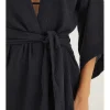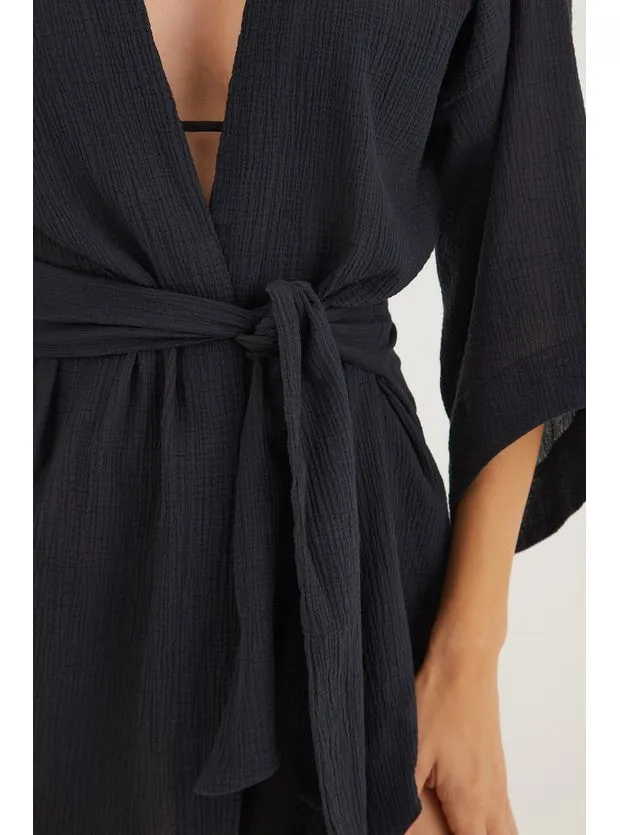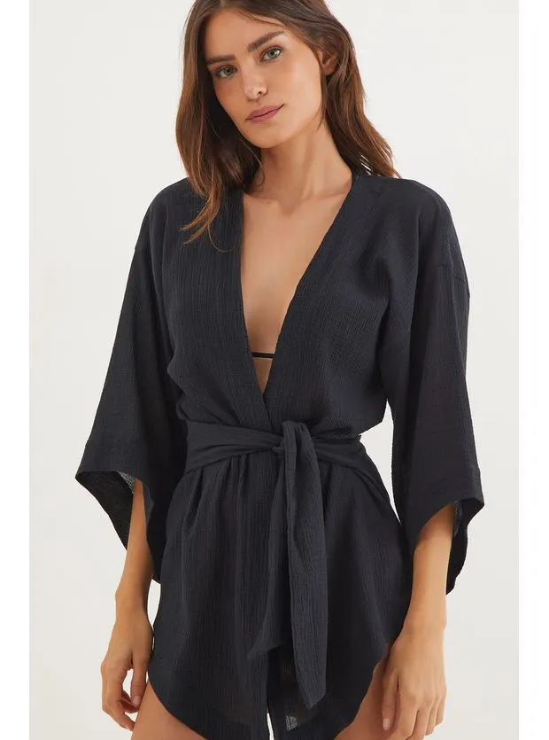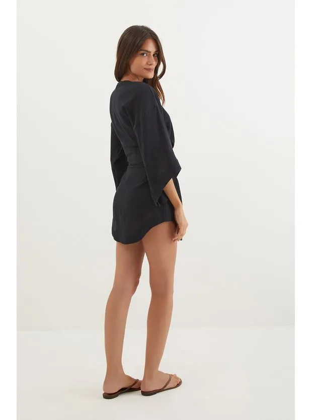 Saída de praia preta curta com manga ampla, decote profundo e amarração frontal. Combine com o seu biquíni preferido, sandálias flats, bolsa de palha, chapéu e outros acessórios ViX.
