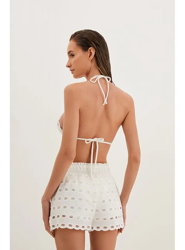 Leve e casual, o short branco Babi é feito de laise especial 100% algodão. Uma peça versátil para usar com seu biquini preferido, sandálias flats, bolsa de palha, chapéu e outros acessórios ViX Paula Hermanny.