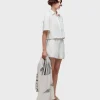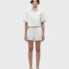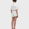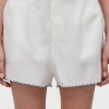 Short. Feminino. Linho com algodao. Regular. Cos de elastico com cadarco de rolote do proprio tecido, bolsos nas laterais e nas costas. Bordado de no na frente. Acabamento de bordado na bainha e na boca do bolso.