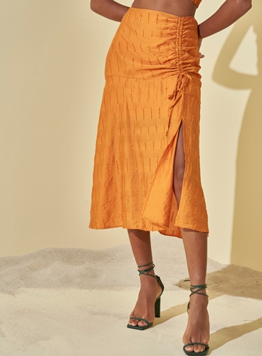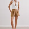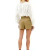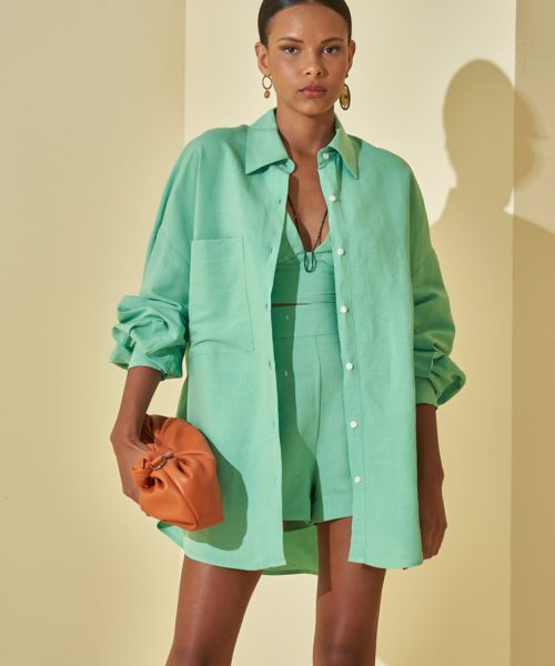 O short verde é confeccionado em malha de poliamida. A peça possui cintura alta, recorte no cós, bolsos posteriores embutidos e frontais modelo faca, recorte frontal, shape solto, caimento reto, acabamento pespontado e fechamento frontal.
