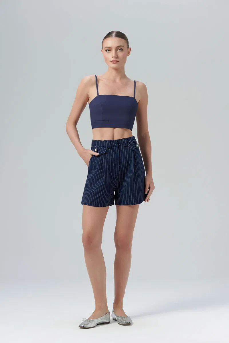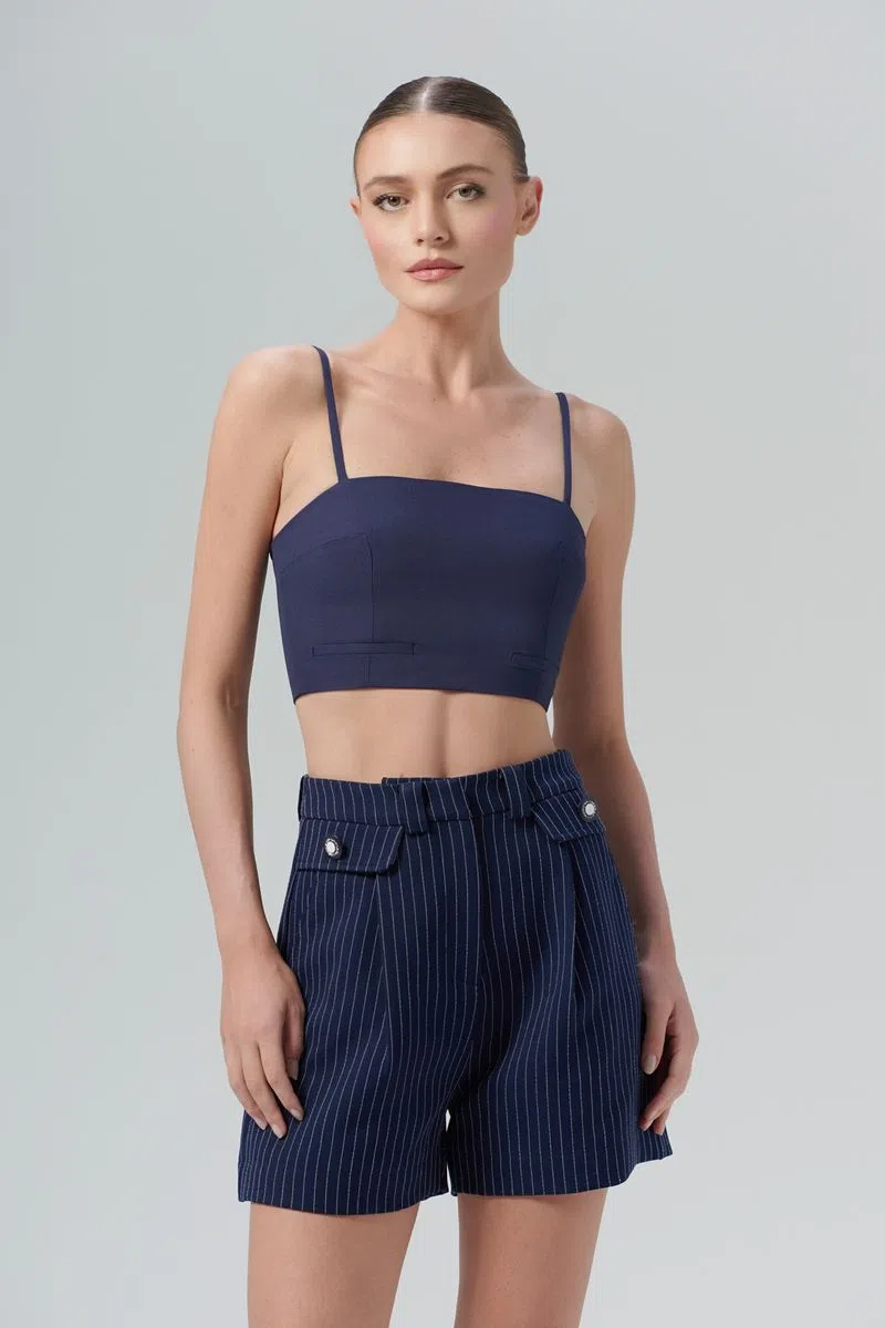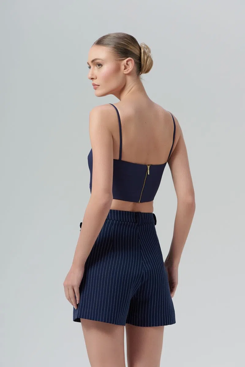 O short Hazel é confeccionado em alfaiataria. A peça apresenta modelagem reta com listras na vertical, estilo de bermuda e bolso fake anterior com botão brilhoso, proporcionando um visual moderno e fashion. Possui cintura alta, bolso faca, cós com passantes para cintos, zíper de nylon, colchete de metal e acabamento pespontado